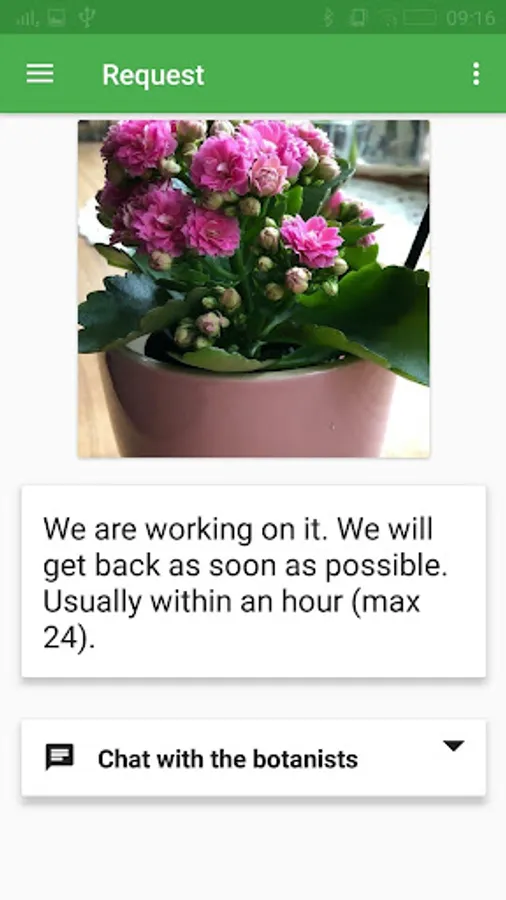 Our team will respond as soon as possible, but the identification usually takes minutes or hours. In average, we manage to solve more than 95% plant requests.