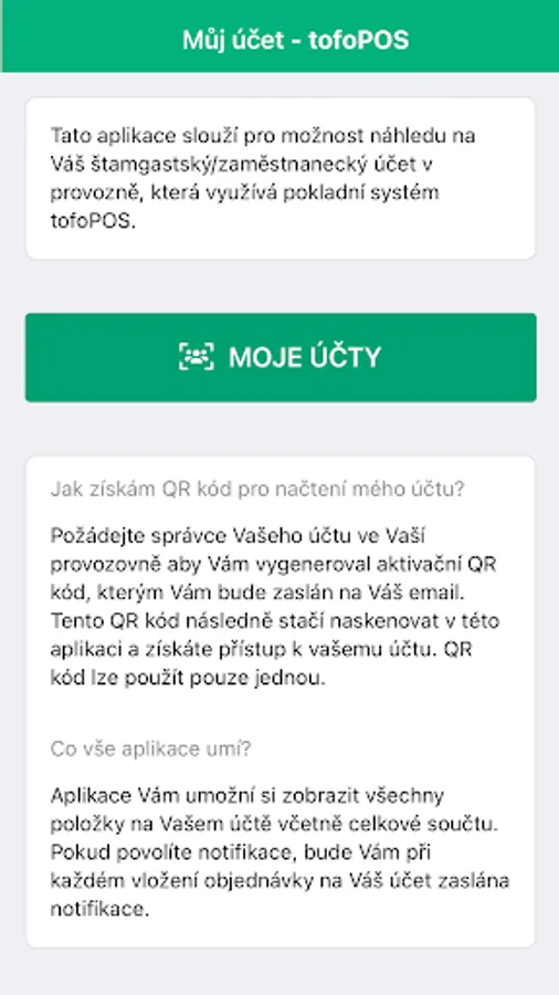 Thanks to this application, you get access to your account in the cashier and you can view the marked items on your account, including checking the total amount. The application can send notifications every time new unpaid items are added to your account. To gain access to your account, the company must generate an activation QR code for you.