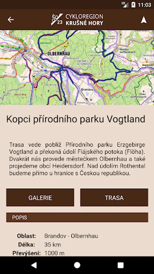 The "Cykloregion Ore Mountains - linking interregional cycling in the Czech-German Erzgebirge" represents cykloregion linking "Ore Mountains" to climb running bike trail on the German side of the border, crossing several mountain areas and bearing the distinctive name Saxon Uplands - "Saxon Mittelgebirge I-6".