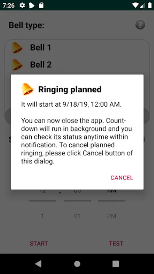 This app serves to ring the bell once at specified time. Ringing can be planned at any time of day, but max 24hrs ahead. You will have possibility to choose one of four ring tones. After ringing is planned, notification will appear and you can close the app. Notification will stay active until ringing is cancelled or specified time is reached.