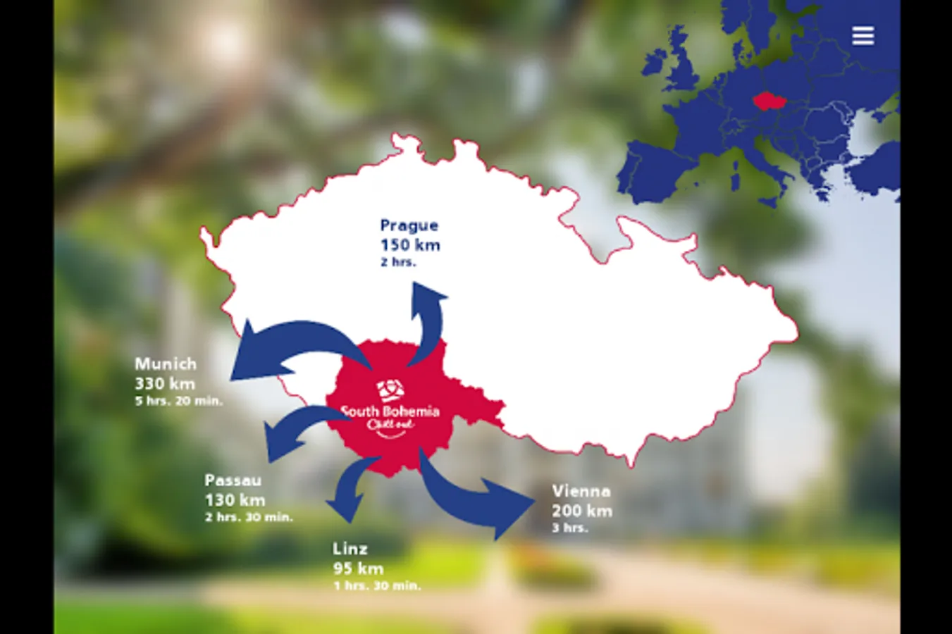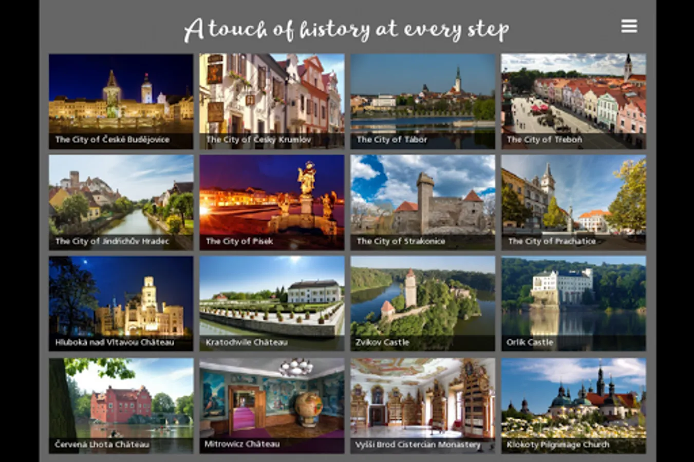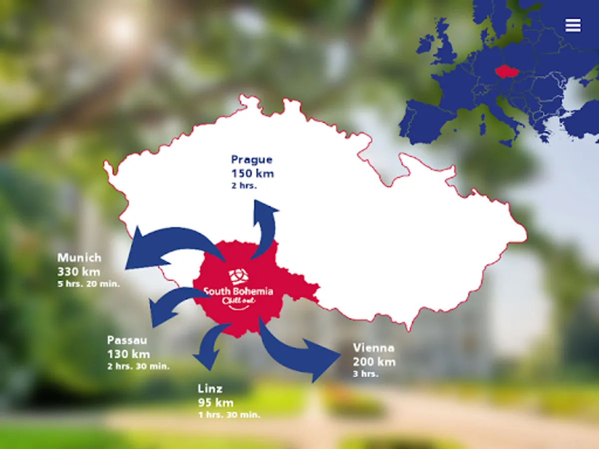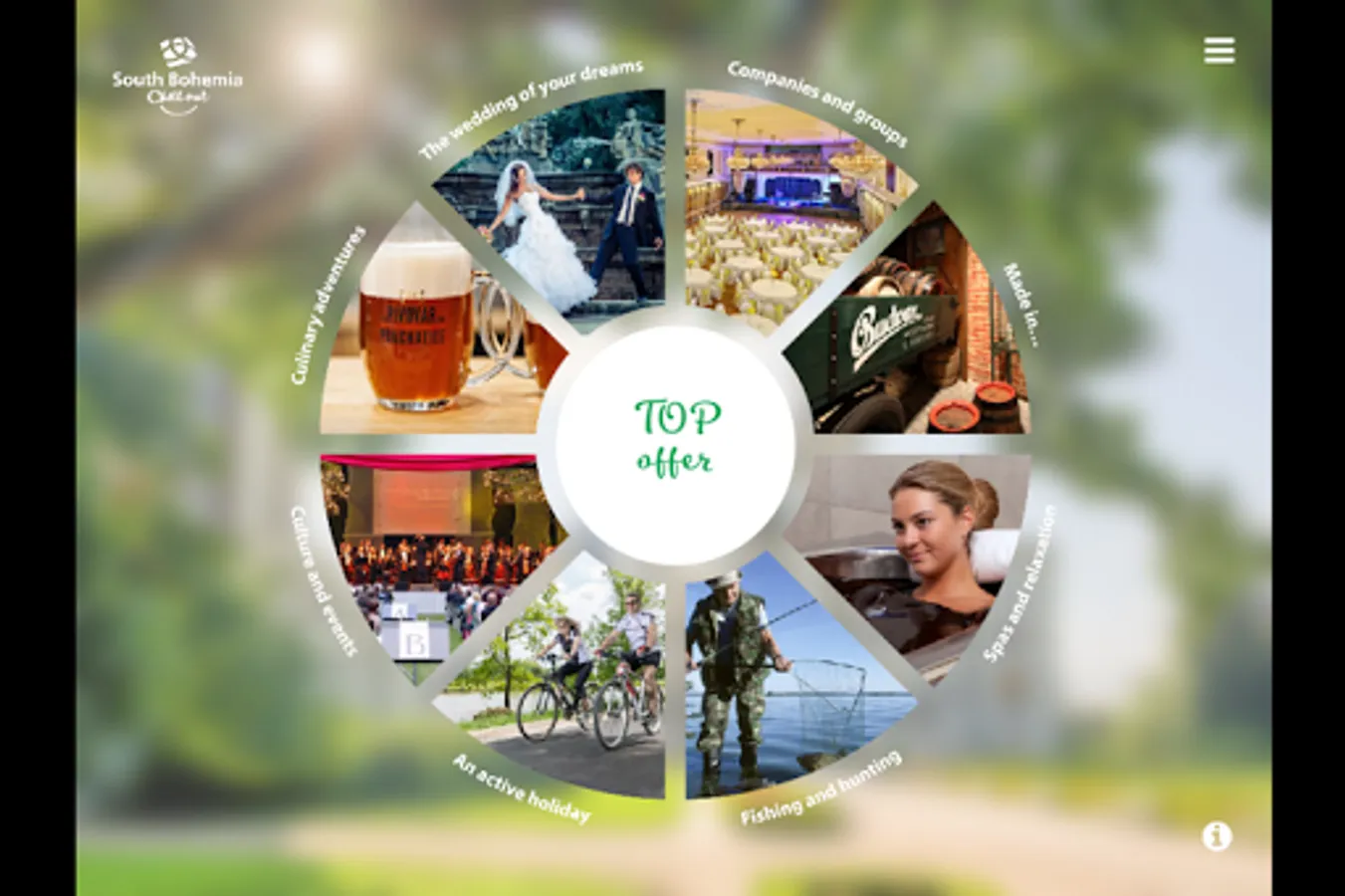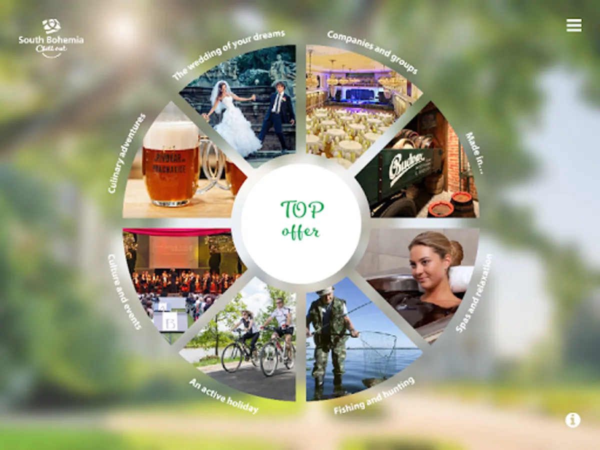 This multimedia application introduces the South Bohemia tourist region. It provides the user with TOP offers of the region introducing historical monuments, natural beauties, culture, gastronomy, active holidays, spa & wellness, fishing and hunting. Some space here is also devoted to products made in South Bohemia which became famous worldwide, favourable offers for companies and groups, and last but not least places suitable for wedding ceremonies. Information on accessibility of the region is also included. Further information regarding individual topics can be found in the submenu, which represents a part of the main menu, just like the TOP offers.