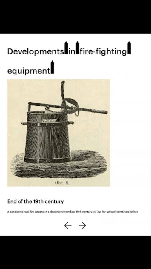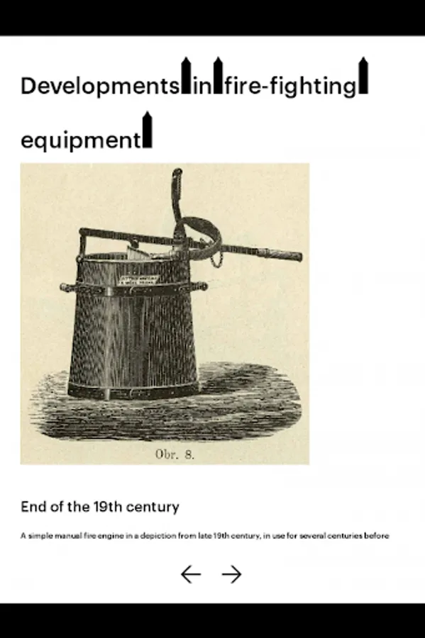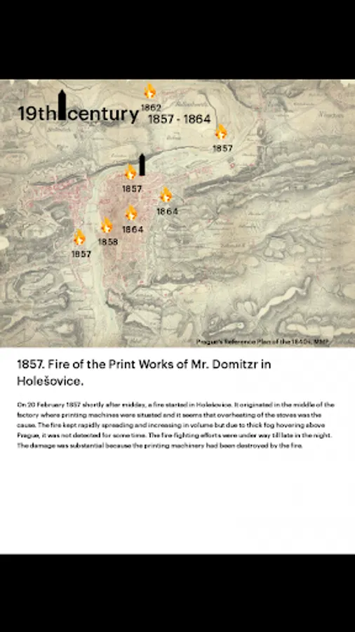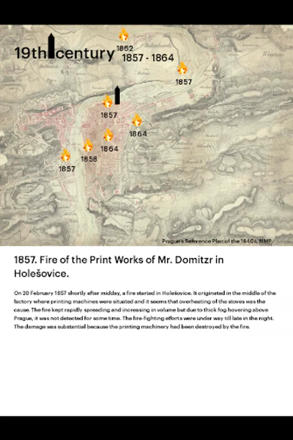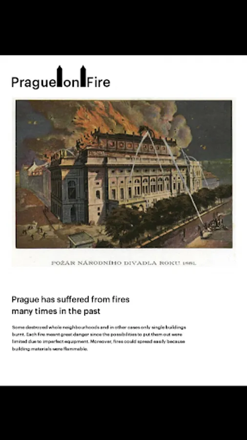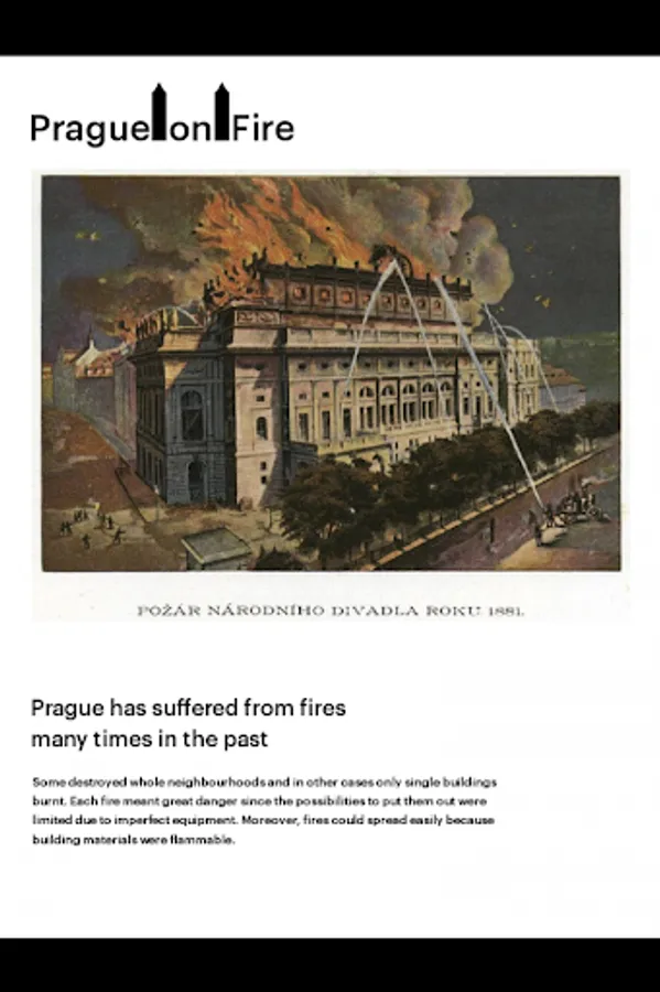 This multimedia application presents, in an attractive and en-tertaining manner, the topic of the age-old threat of fire for Prague and the ways of fighting fires and organising firemen in the years past. Fires from the 12th to 20th centuries are described in ac-counts of contemporaries, as well as in many depictions – fires in the 19th century are shown in graphic works full of interesting de-tails.