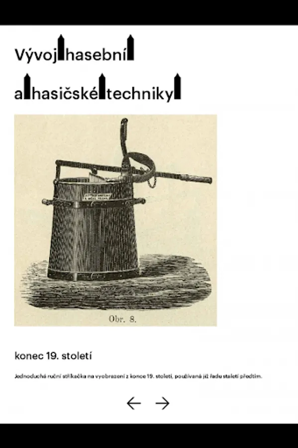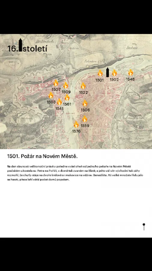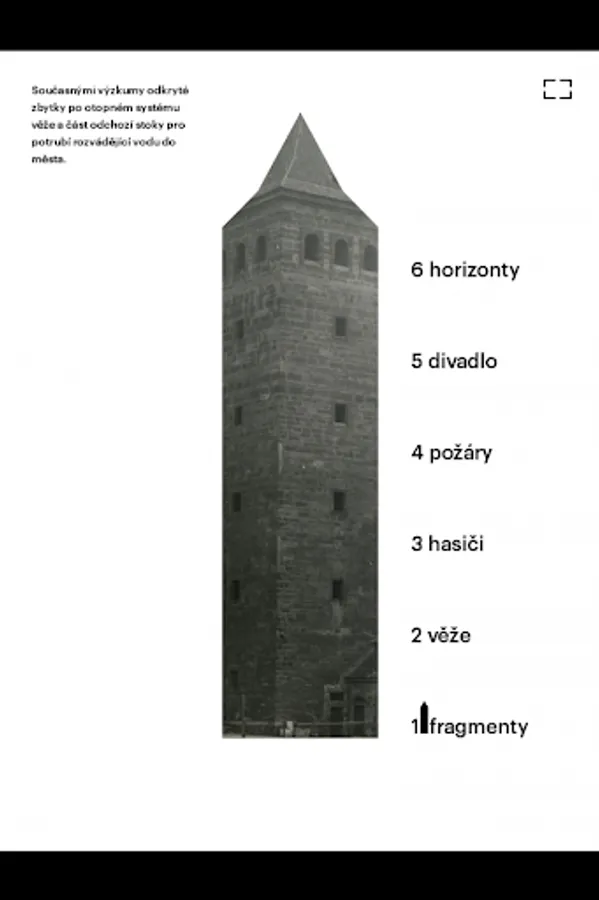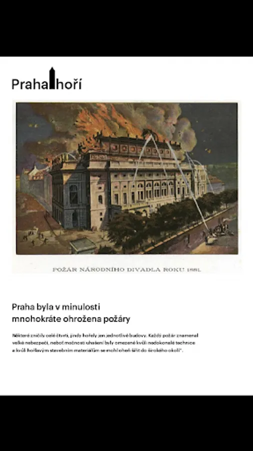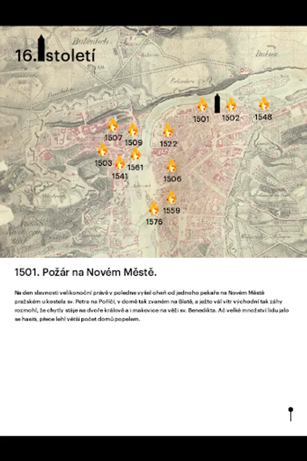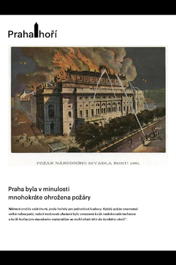 This multimedia application presents an attractive and entertaining way exhibition with the theme of the eternal threat of Prague fire extinguishing methods and organization of firefighters in times past. Fire 12 to 20 century are explained using historical descriptions and illustrations abound - an interesting 19th century fires appear mainly prints depicting many details. Predictive value period of image materials is enhanced by their rozpohybováním through animations captured events, thereby receiving a static representation of dynamic striking appearance. The exhibition is located in a water tower from the 17th century, engineering construction, which is part of the stone towers in historic Prague whose access to the old City of Prague Museum. The tower is open to the public for the first time and offers visitors a multi-genre exhibition Prague burns with significant use of new media, but also an unusual view of the city from the observation area at the top of the tower, which served as the exclusive lookout in the 17th century.