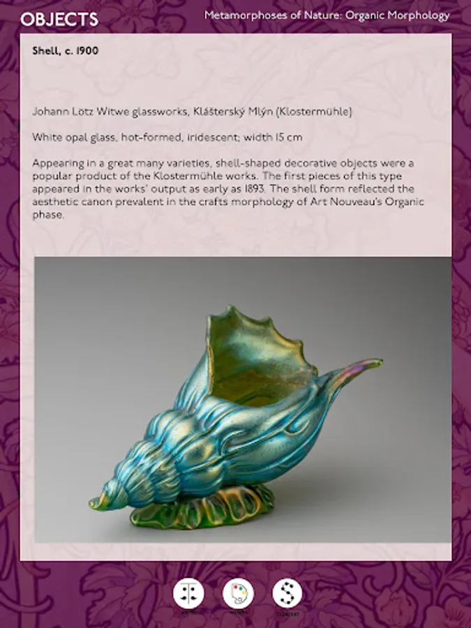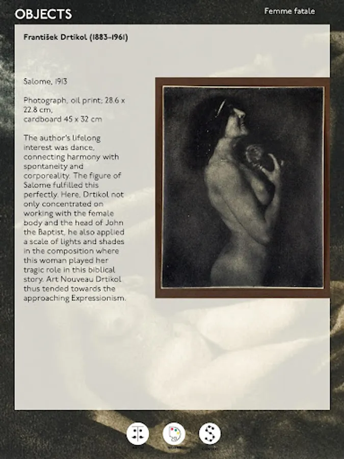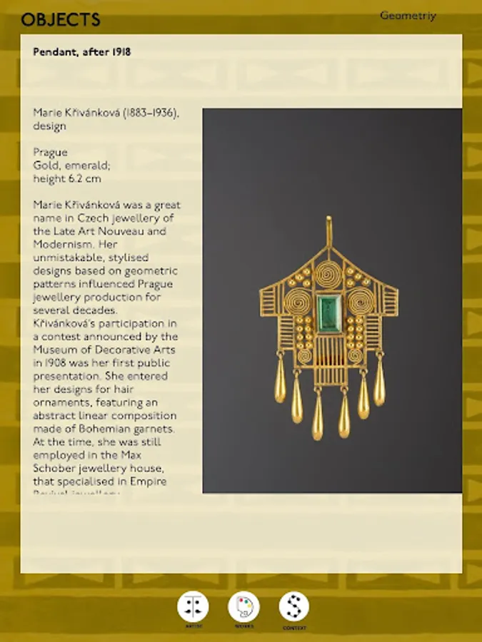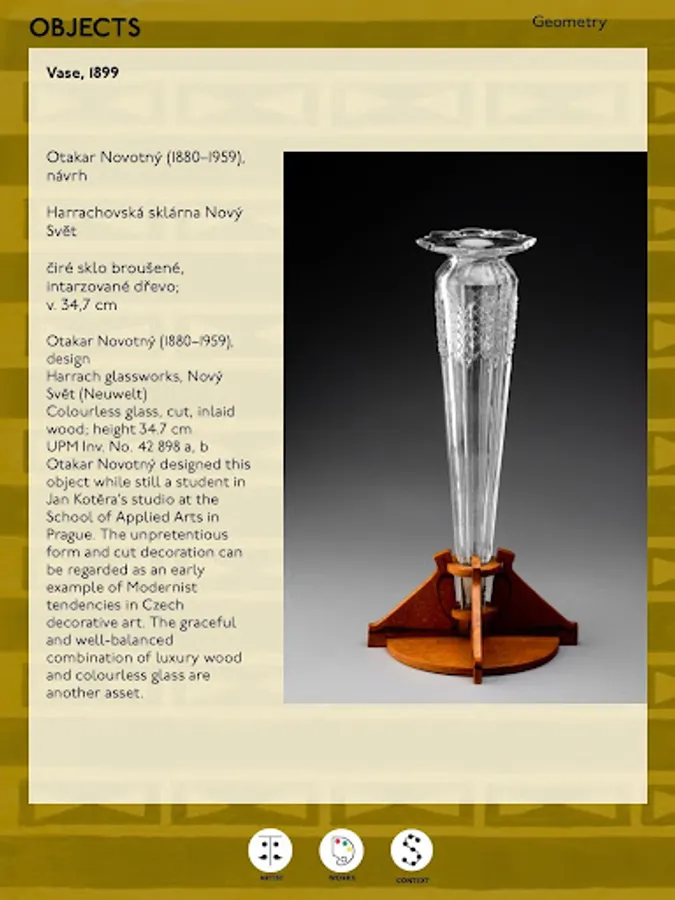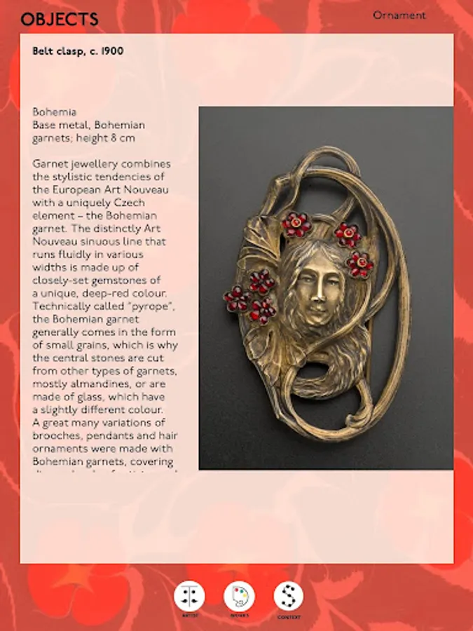 The Museum of Decorative Arts in Prague has prepared an application for the exhibition Vital Art Nouveau 1900, running until 2016 at the Municipal House in Prague, with information on selected items on view, their creators and the period context. The application includes the fields of clothing fashion, poster art, interior design and the visual idioms of artists‘ associations. The objects rendered in the style of Organic or Geometric Art Nouveau also acquaint its users with the exhibition‘s thematic areas, e.g. The Movement of the Soul and Femme Fatale. The application and exhibition present a selection of the most outstanding works of Czech and European Art Nouveau art. They are intended to show the Art Nouveau arts and crafts as part of the groundbreaking, forward-looking trends and emancipation efforts that evolved in the late 19th century, as a reformist art movement that strove for “the multiplication and intensification of life”.