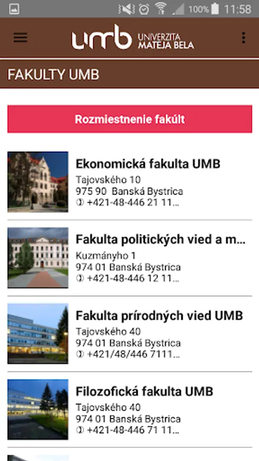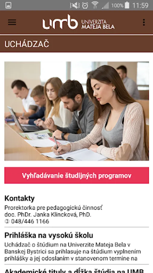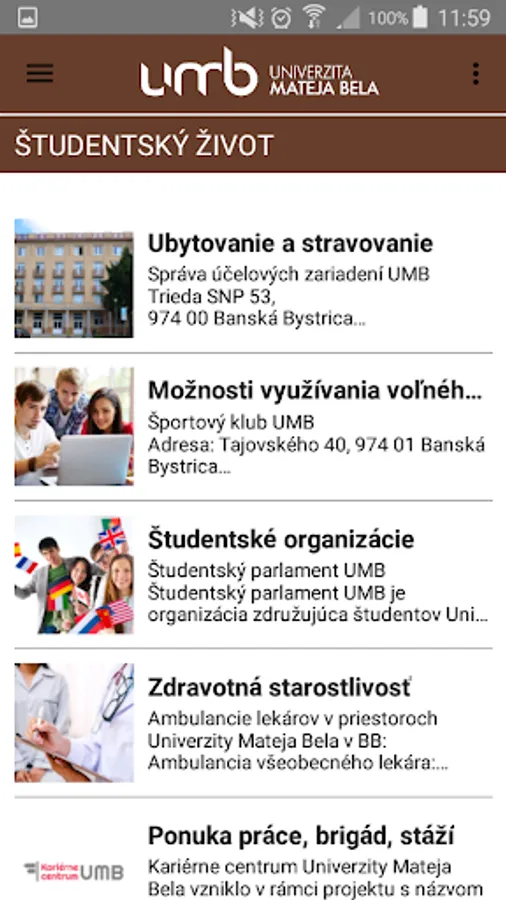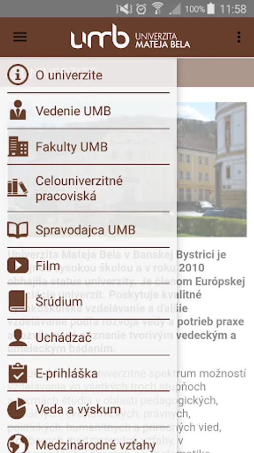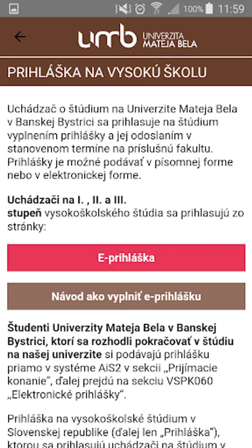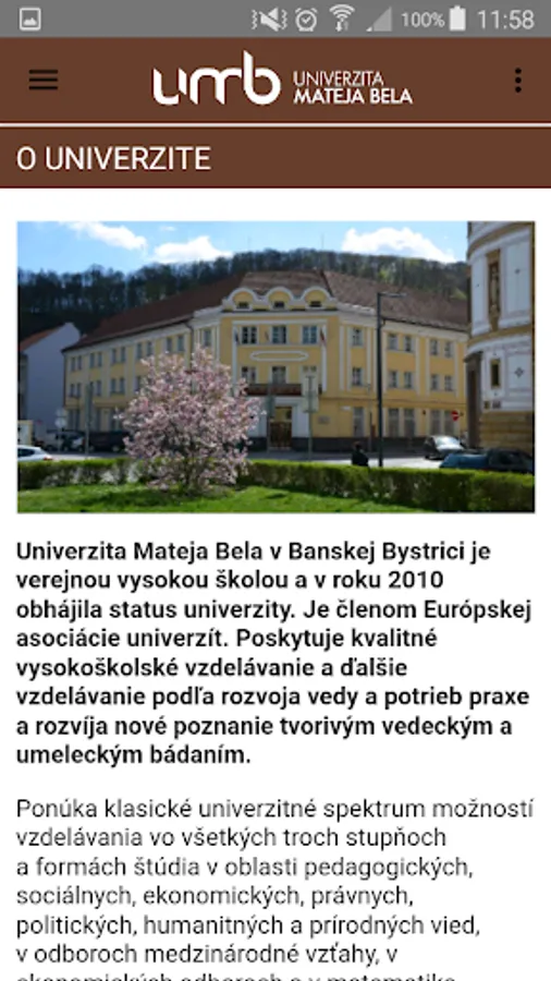 The application of Matej Bel University in Banská Bystrica contains important information about the school. The application includes links to an e-shop, an electronic application, or an academic year schedule. You will also find information about the university, faculty, study, or student life at the university. There is also GPS navigation, contact form and necessary contacts.
