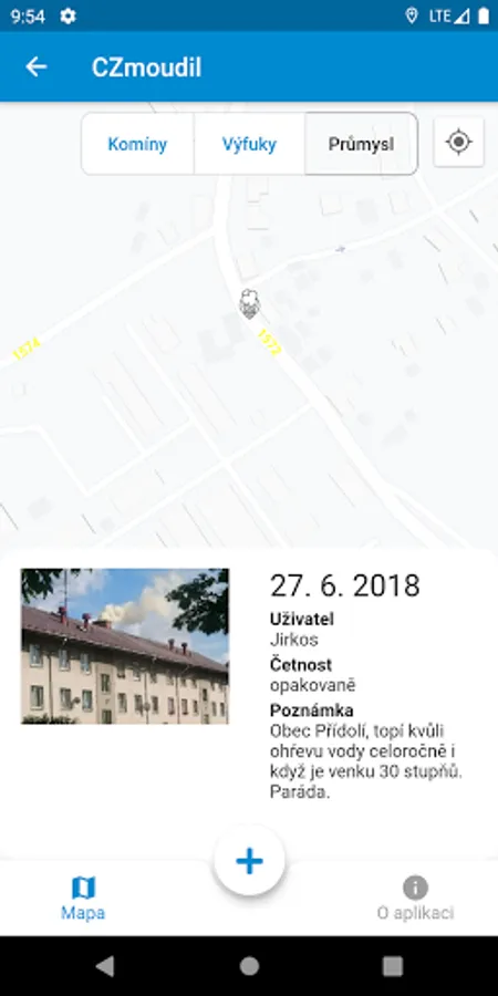 Take a photo or add a photo of the air pollution source from the photo gallery. Click on the "+" button to add a photo that you will place in one of three categories - chimneys, exhausts, industry. Large stationary sources are already marked on the map, so just click on the selected object and upload a photo to it.
