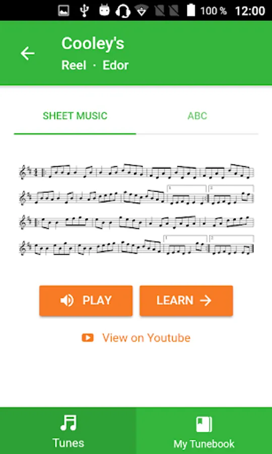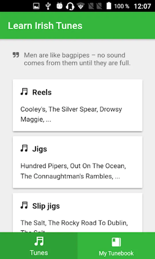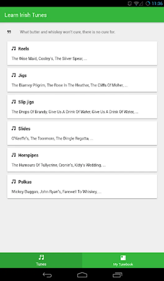 Application contains over 100 of the most famous and popular traditional Irish tunes - reels, jigs, slip jigs, slides, hornpipes and polkas. Each tune contains both sheet music and ABC notation. Doesn't matter whether you are tin whistle or fiddle player, this app is made to be useful for everyone.