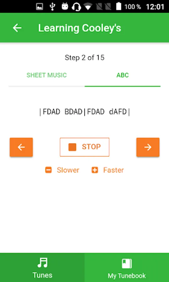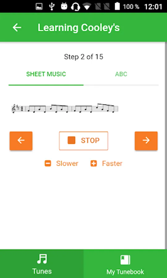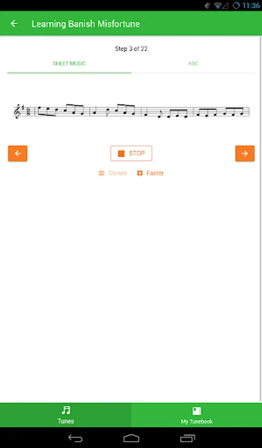 Each tune is split into phrases and bars. The application walks you through them step by step. You listen to, play along and repeat each phrase in selected tempo until you feel comfortable playing it, then move to the next one. You can select from 4 predefined tempos, from the slowest to the fastest.