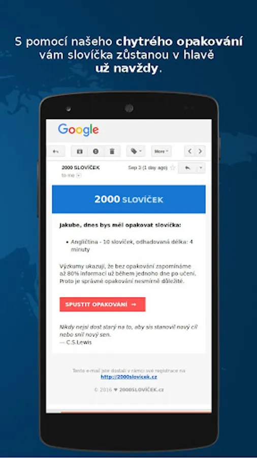 The application itself to warn of the impending repetition of e-mail, so they do not have to constantly think about. In the e-mail you can see how many words you have to repeat and estimated time of how long you will last repetitions, about.