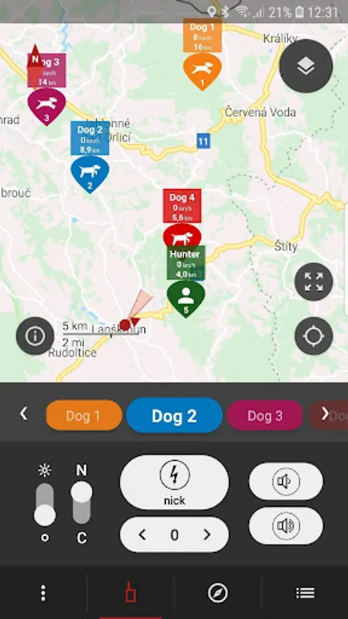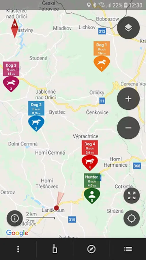 - Viewing dogs on an online or offline map with track logging, saving, and playing back later