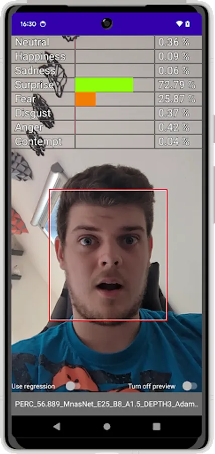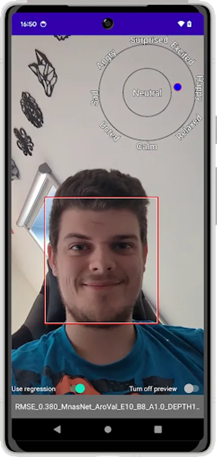 A real-time facial emotion detection application using neural networks. Classifiers and regressors are used for detection with visualization of the neural network output and drawing a bounding box around the detected face in the preview of the front camera feed. The camera feed can also be turned off. The latency of the currently selected neural network model is also displayed.