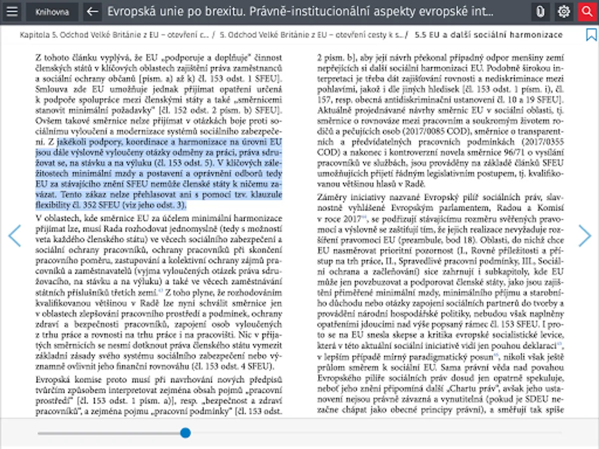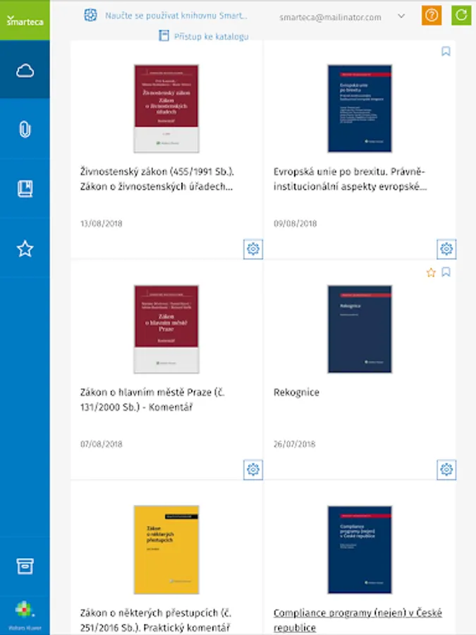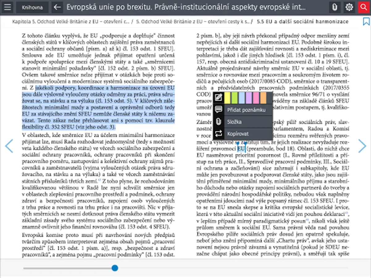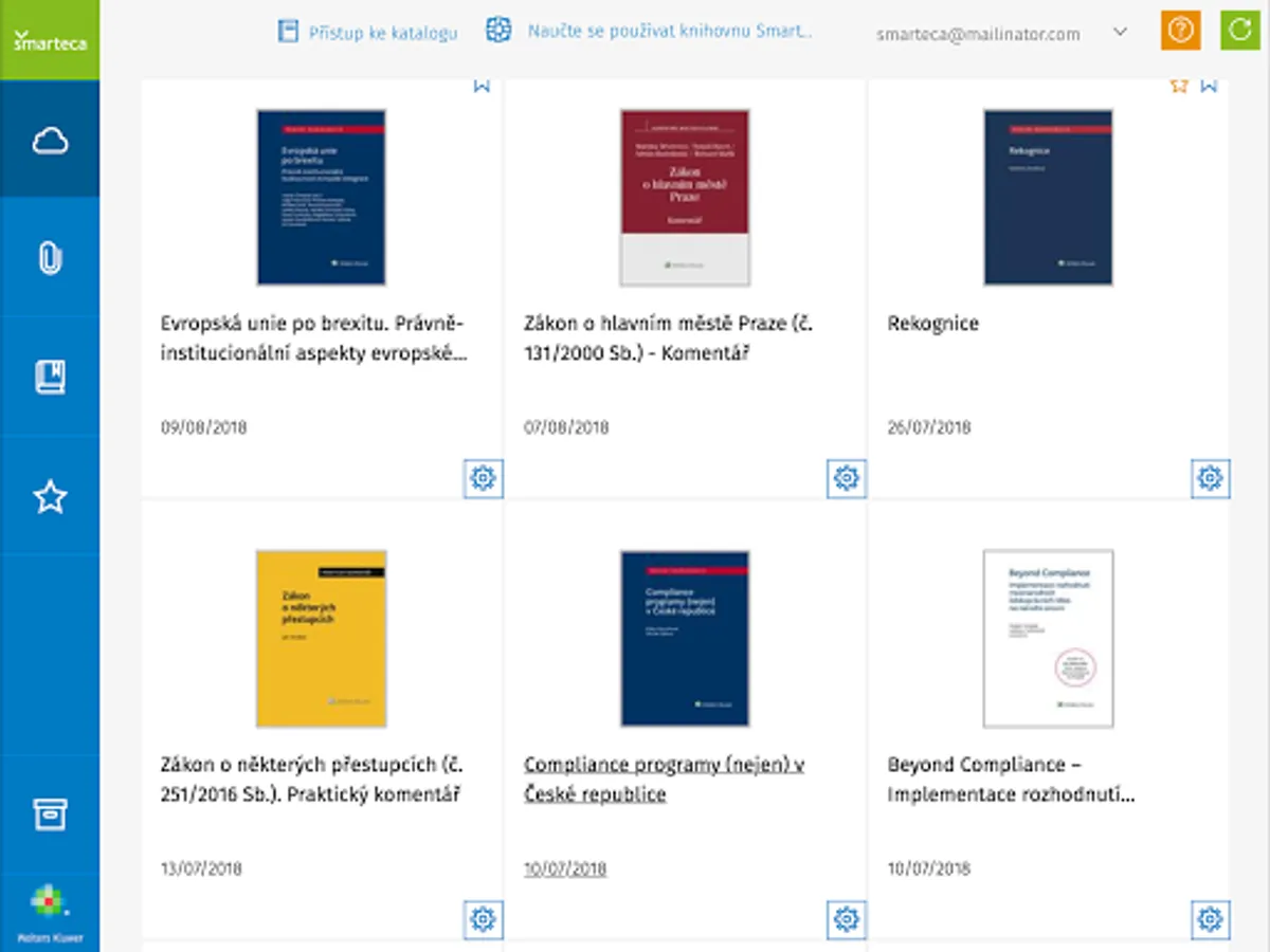 Smarteca builds on the WK eReader application. This is Wolters Kluwer's e-book reader, a. Smarteca's application is specially crafted to work with literature. The application is linked to the Wolters Kluwer e-shop. The e-book will be automatically uploaded to the user account accessible in the reader environment after entering the login information created by the shoppers in the eShop. After downloading, it is possible to read without an online connection and to work with eBook text: color highlight text, create notes, bookmarks. Search is possible both in the text of the book, as well as in your own notes and text highlighting.