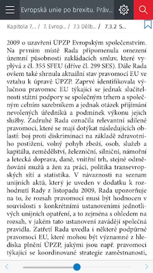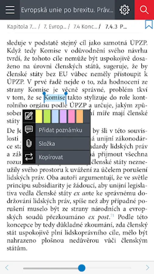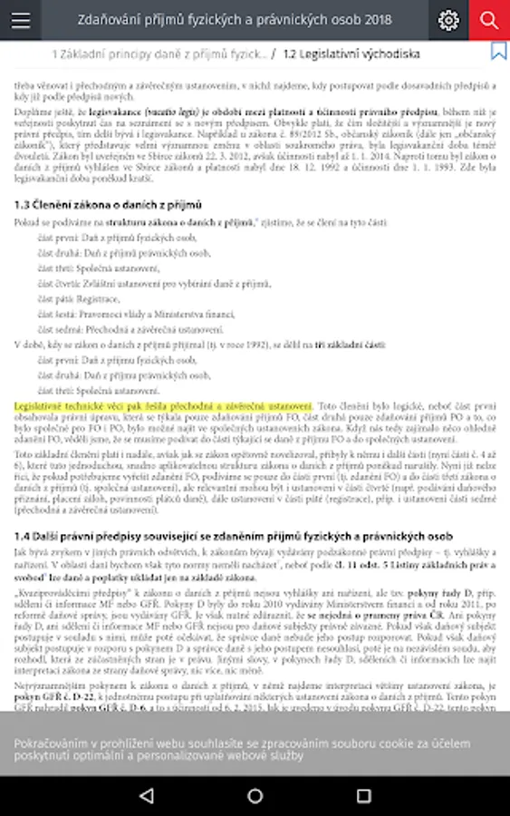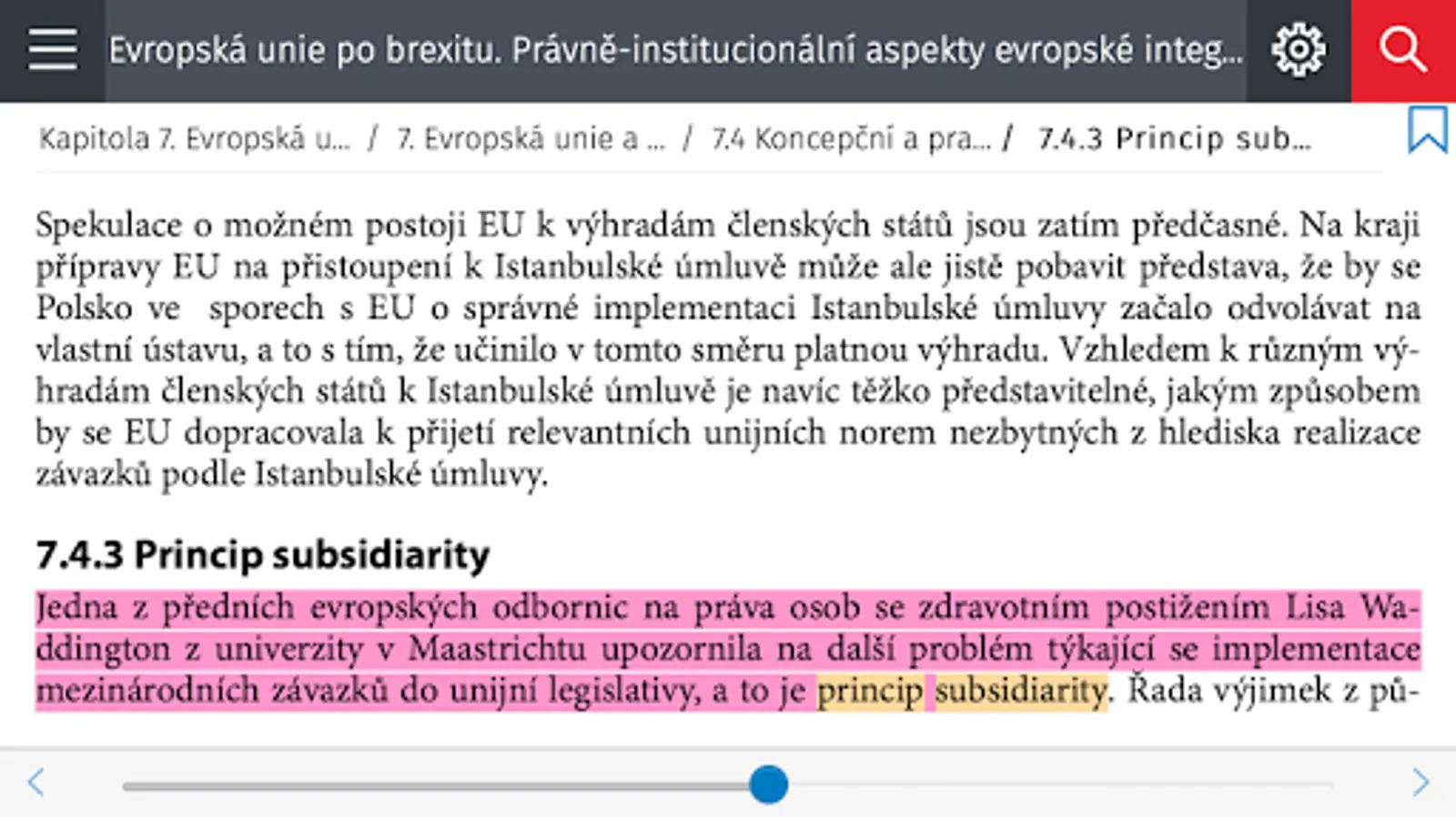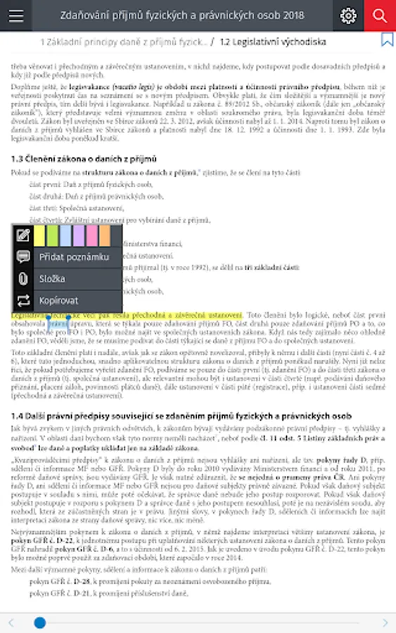 Smarteca builds on the WK eReader application. This is Wolters Kluwer's e-book reader, a. Smarteca's application is specially crafted to work with literature. The application is linked to the Wolters Kluwer e-shop. The e-book will be automatically uploaded to the user account accessible in the reader environment after entering the login information created by the shoppers in the eShop. After downloading, it is possible to read without an online connection and to work with eBook text: color highlight text, create notes, bookmarks. Search is possible both in the text of the book, as well as in your own notes and text highlighting.