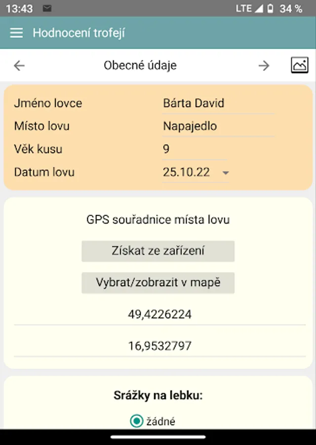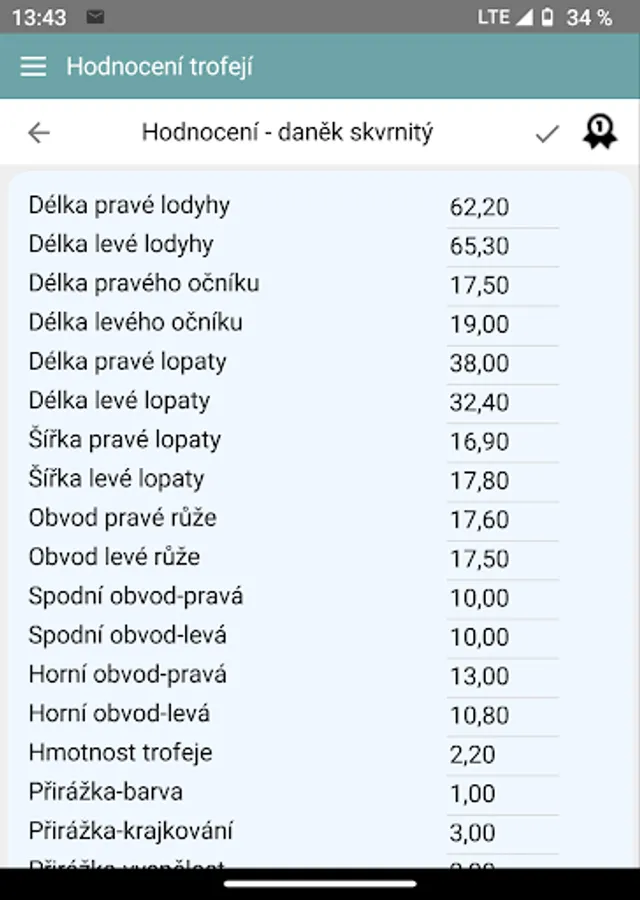 The application allows the evaluation of trophies of all common types of trophy game, while other less common types of trophies will be added in future versions (hides and skulls of beasts, elk, chamois, bezoar goat).