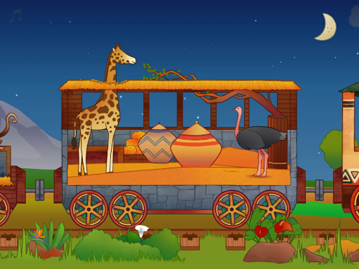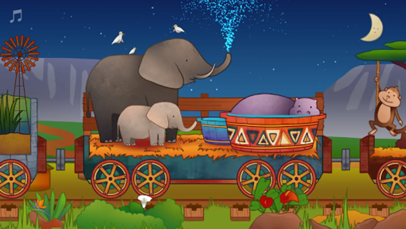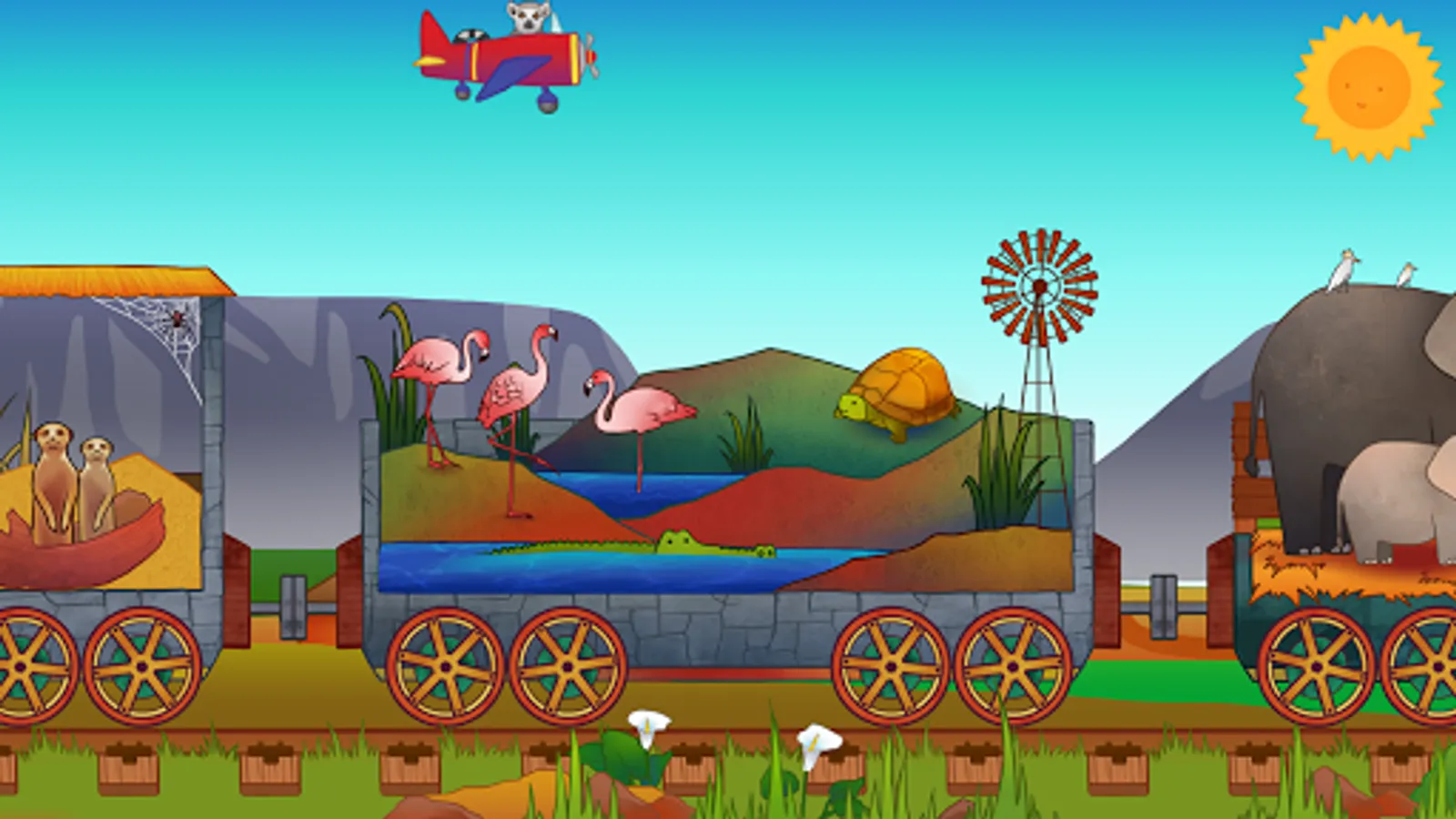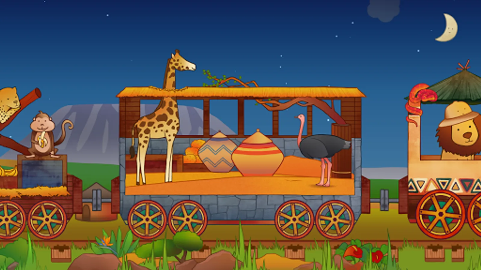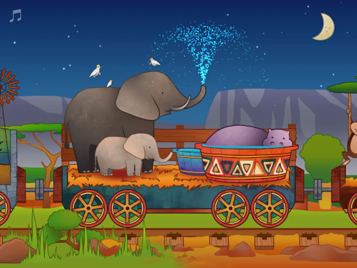 All aboard the Safari train, we're going to Africa! Join the lion conductor and his fellow travelers on a journey through a fun and interactive landscape. Touch the monkey and watch him pull the leopard's tail, listen to the laughing zebra, and see the sneezing baby elephant.