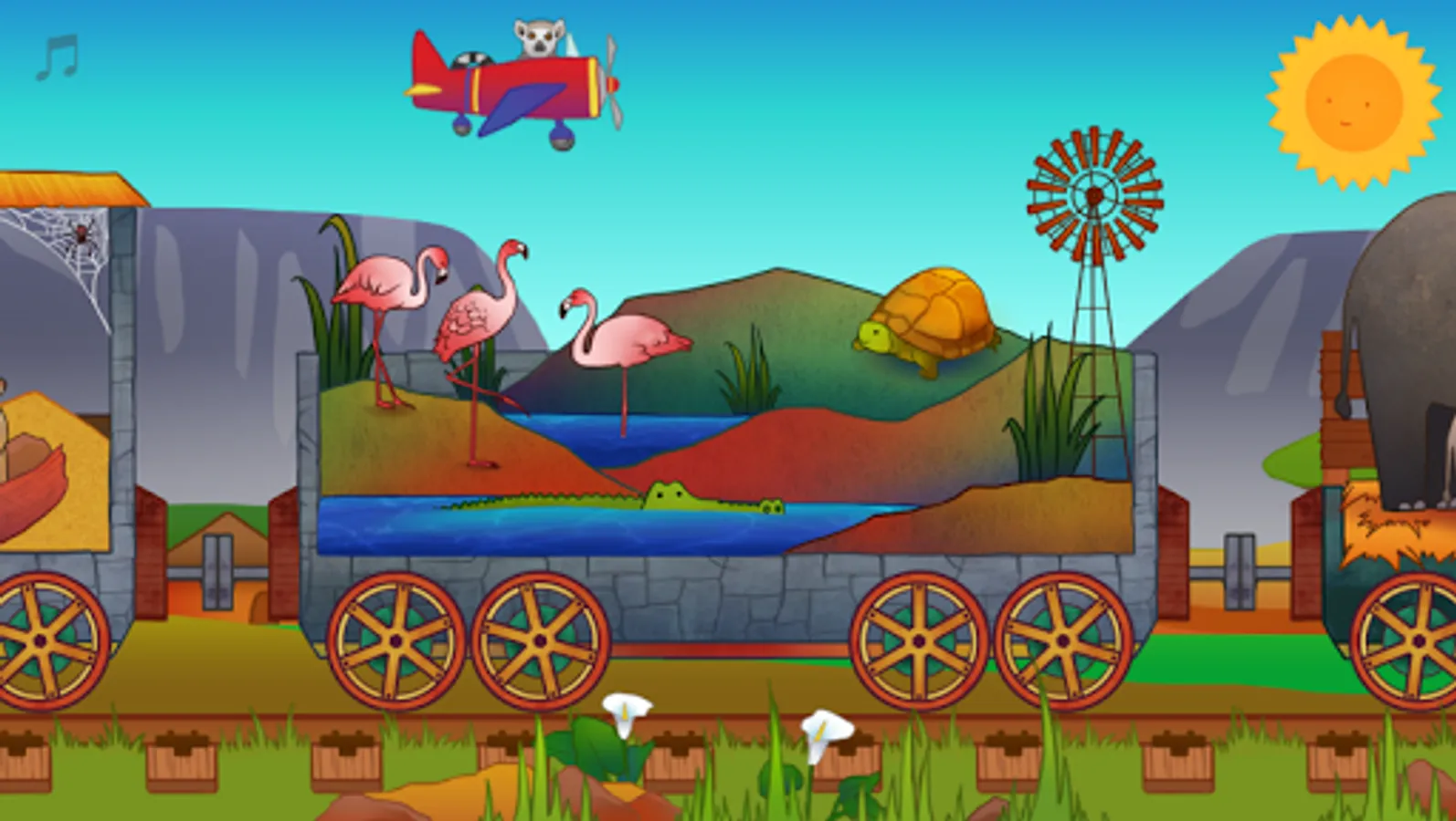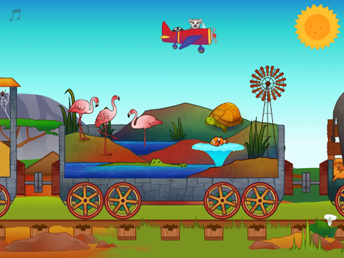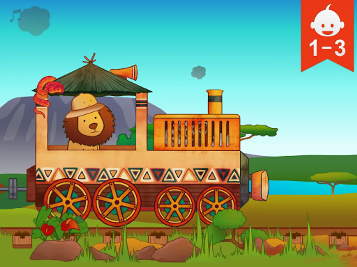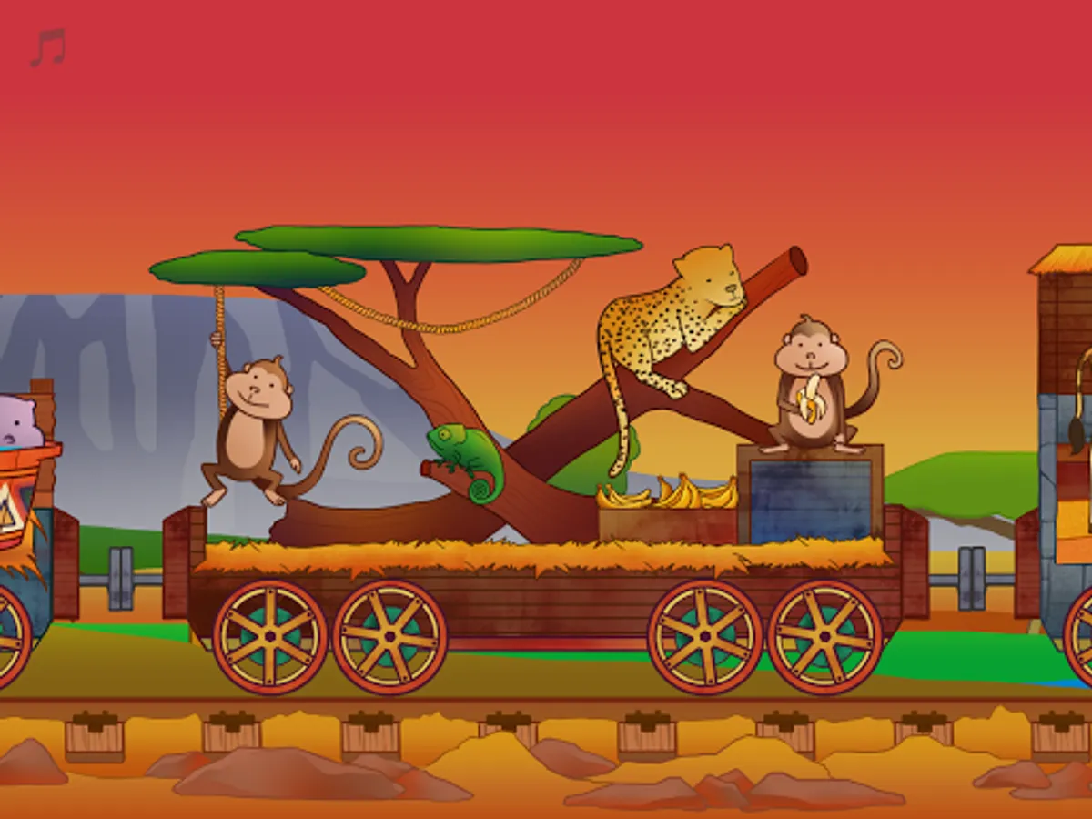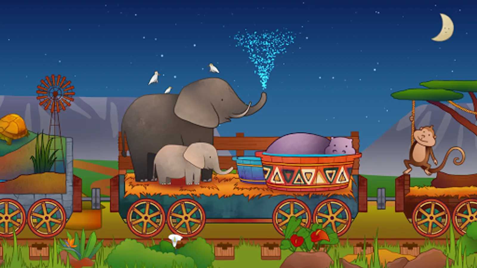 All aboard the Safari train, we're going to Africa! Join the lion conductor and his fellow travelers on a journey through a fun and interactive landscape. Touch the monkey and watch him pull the leopard's tail, listen to the laughing zebra, and see the sneezing baby elephant.