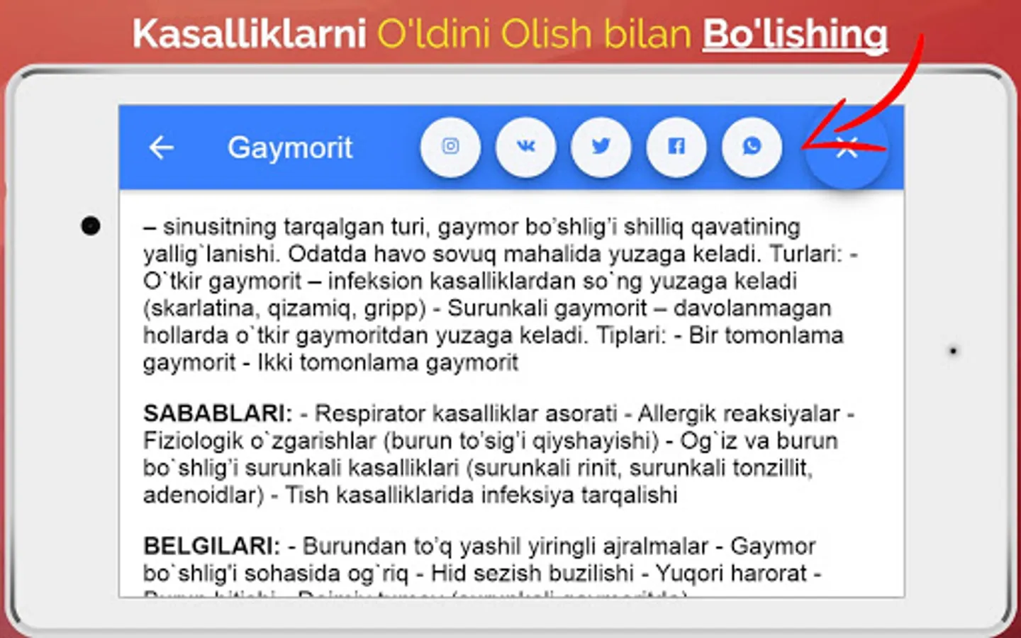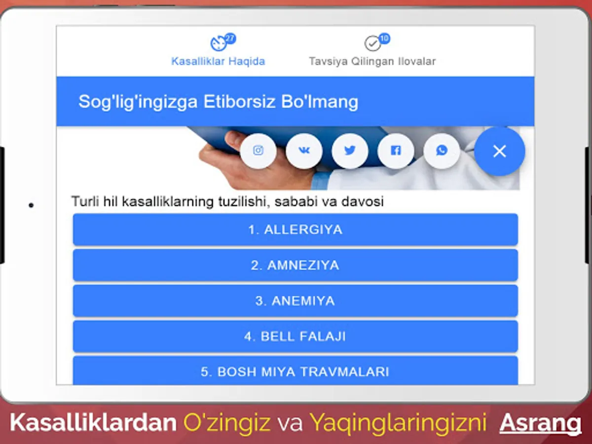 Ilova da gi Kasalliklarning to'liq tafsiloti bilan va Kasallikning oldini olish yo'li bilan tanishib chiqishingiz mumkin. Kasallikning davaloshdan ko'ra uni oldini olgan yaxshi. O'zingiz va Yaqinlaringizni Asrang. Sog'lig'ingiz ga be etibor bo'lmang. Har doim Sog' Salomat Bo'ling.