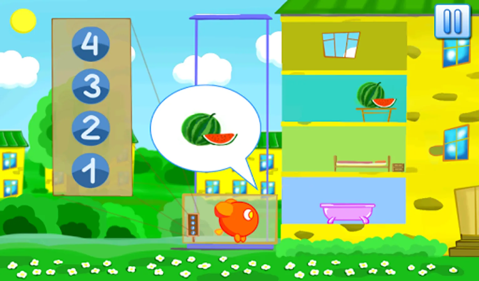 The first level characters want to get home. They think about the subject on the floor (the idea appears in the cloud). The child presses the buttons on the elevator, and the hero gets to the desired floor. If you select the wrong button, the elevator still rises to the selected floor and then back down. This character is the elevator. This allows the child to relate the magnitude and importance, which bears the figure.