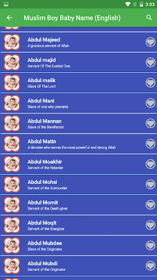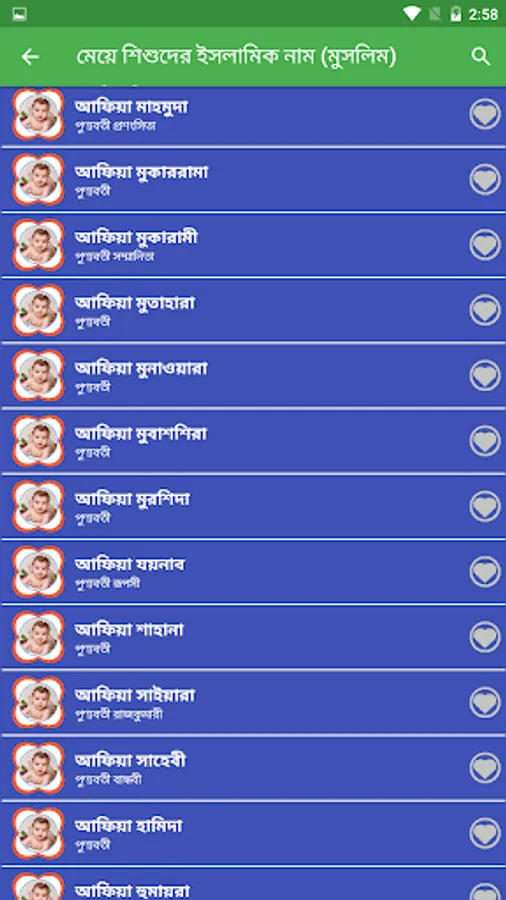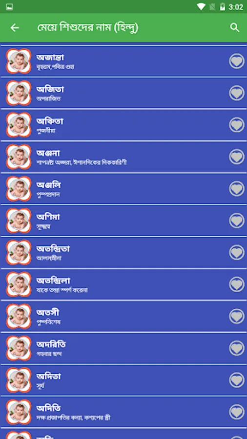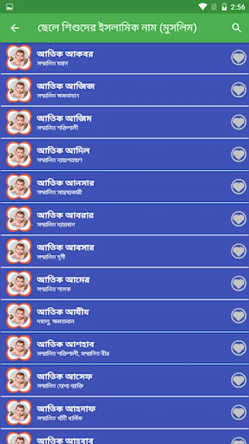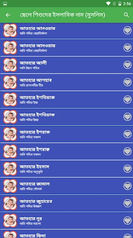 শিশুদের সুন্দর নাম ও বাংলা নামের অর্থ দিয়ে শিশুদের নামের তালিকা অ্যাপটি তৈরি করা হয়েছে । মুসলিম শিশুদের ইসলামিক নাম ও অর্থ সহ নামের বই থেকে আপনার শিশুর জন্য ইসলামিক নাম রাখতে পারবেন । মুসলমানেরা শিশুদের নাম রাখার সময় চায় তার মেয়ে অথবা ছেলে শিশুটির নাম যেন ইসলামিক নাম হয় তাই আমরা অ্যাপটিতে মেয়েদের ইসলামিক নাম ও অর্থ সহ দিয়েছি আশা করি ইসলামিক নাম গুলো আপনাদের ভাল লাগবে । তাই আমাদের অ্যাপটি ডাউনলোড করে আপনার শিশুদের সুন্দর নাম খু্ঁজে বের করুন । অনেকে শিশুদের নাম রাখেন ঠিকই কিন্তু নামের অর্থ জানেন না তাই শিশুদের নামের অর্থ সহ আমরা এই অ্যাপটি তৈরি করেছি ।