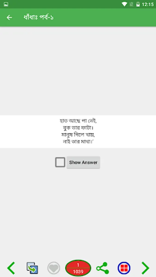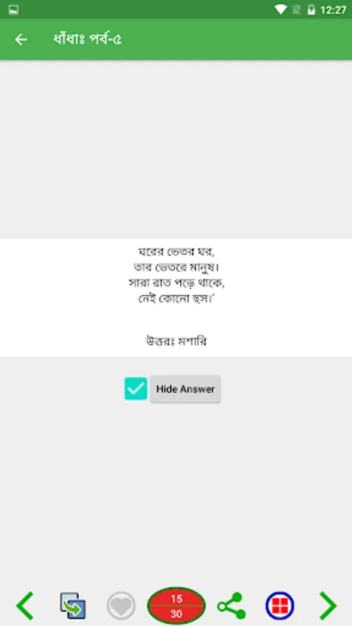 যে কোন আড্ডা জমানোর জন্য ধাঁধার কোন বিকল্প নেই। তাই আমারা “(Bangla Puzzle)” নামে মোবাইল এ্যাপ তৈরী করেছি। যে এ্যাপটি মোবাইলে নামিয়ে নিয়ে যে কোন আড্ডায় বুদ্ধির প্রশ্ন করে তাক লাগিয়ে দিতে পারবেন যে কাউকে। তাই এখনই এ্যাপটি আপানার মোবাইলে ইনস্টল করে নিন এবং বন্ধু ও পরিবারে সাথে শেয়ার করুন। আমাদের এ্যাপটি ভাল লাগলে ৫ স্টার দিয়ে নতুন এ্যাপ তৈরীতে উৎসাহিত করুন।