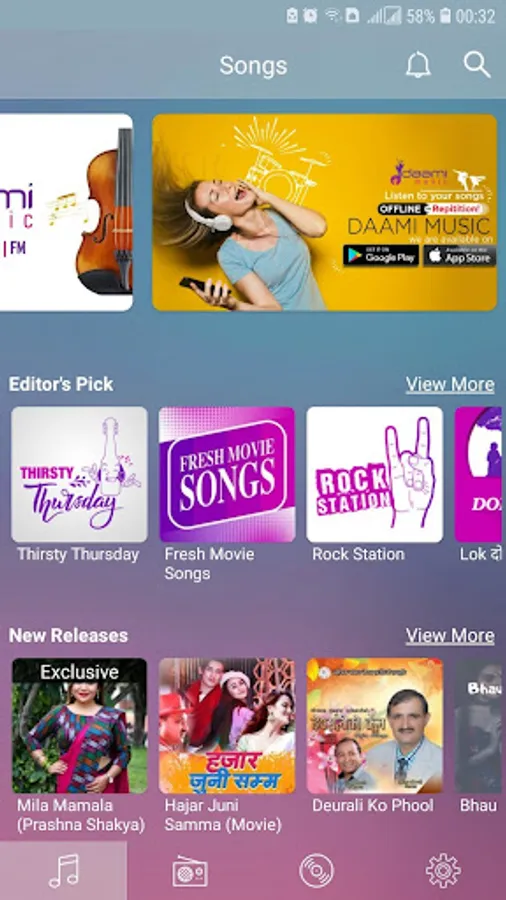 Daami Music lets you search thousands of Nepali songs and play your favorite music with the highest audio quality available.You can listne them for free !!!