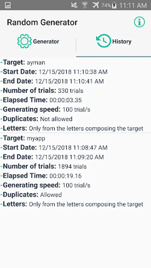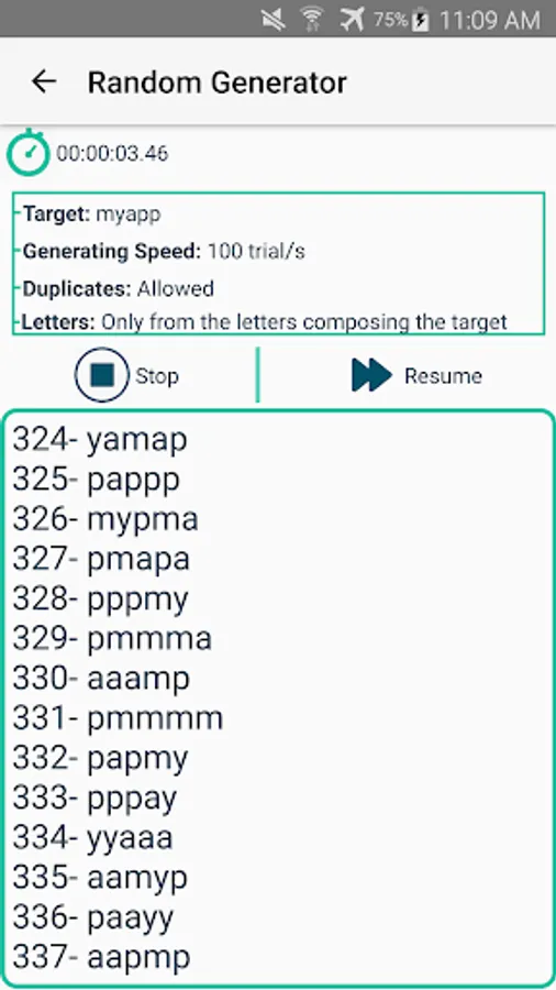 Witness our app randomly composing your target by generating letters and checking each time if it matches your target.