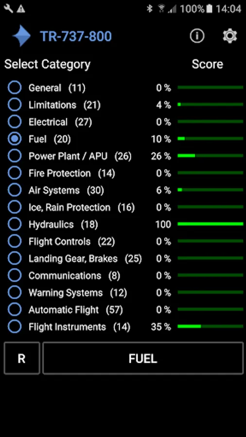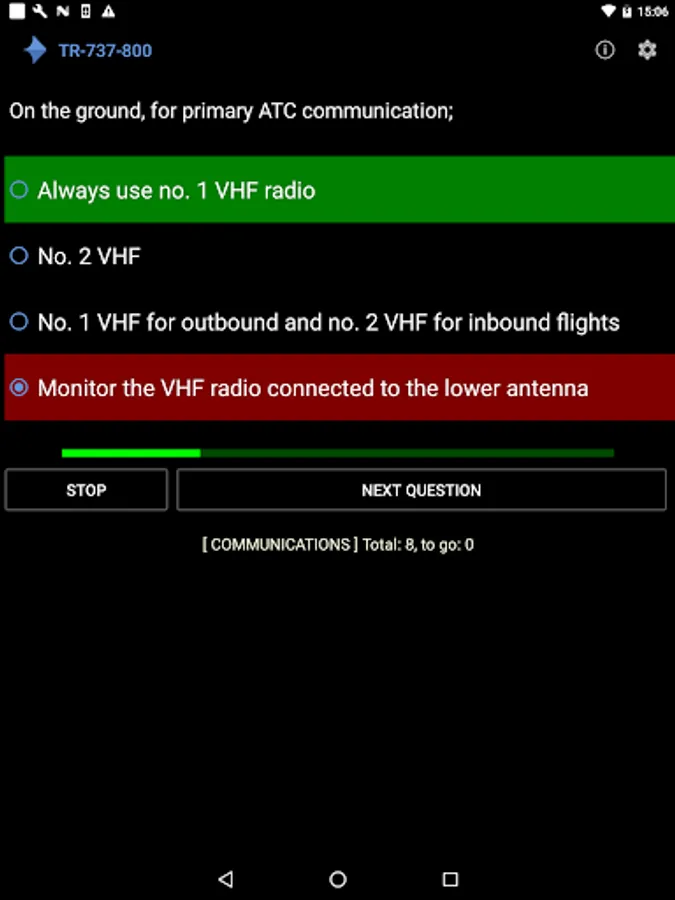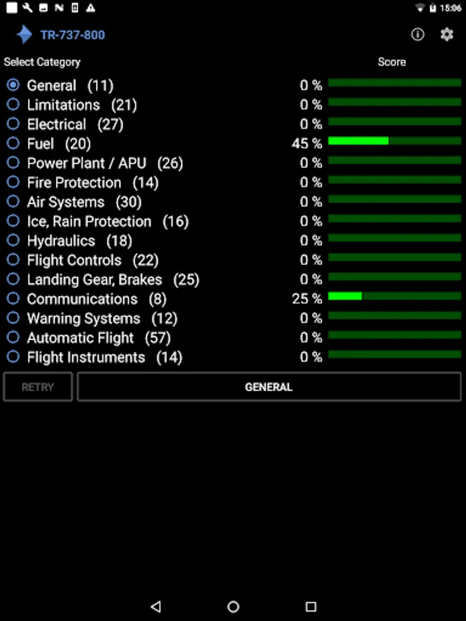 This app provides a Boeing 737-800 Type Rating Quiz. With 322 questions shared over 15 different categories, this quiz helps you thoroughly in the preparation of the Type Rating 737-800 exam.