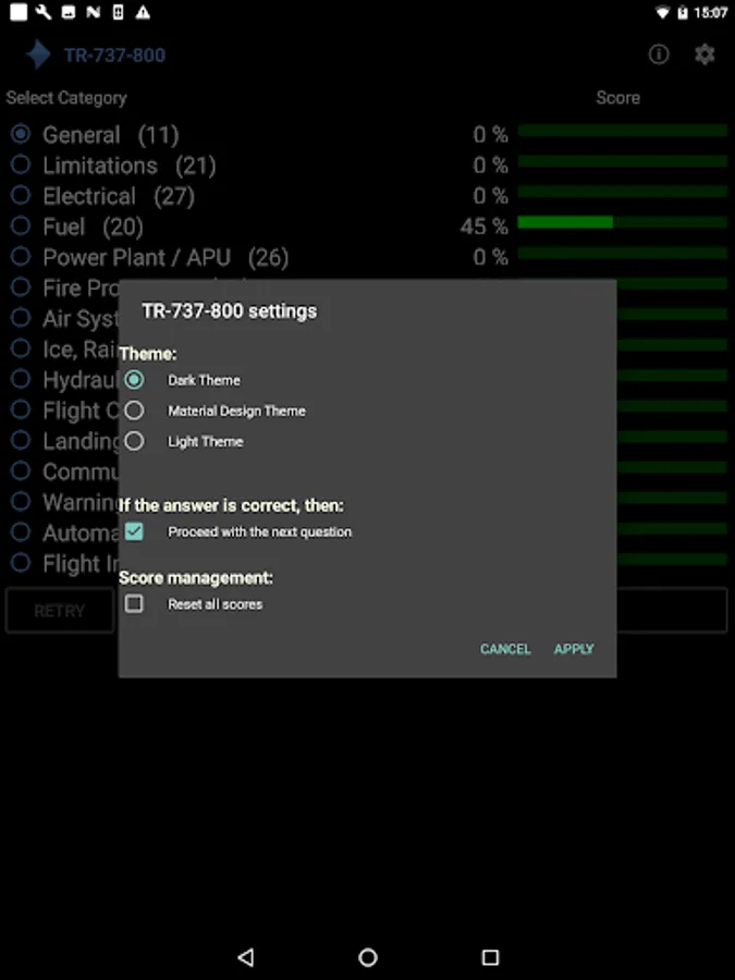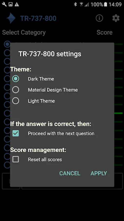 The application provides a score result per category and a feature to conduct all questions per category until you have a 100% score. Intermediate score results are saved and reloaded when you start the app. The app has different themes (dark, material design and light).