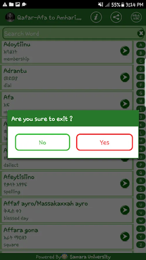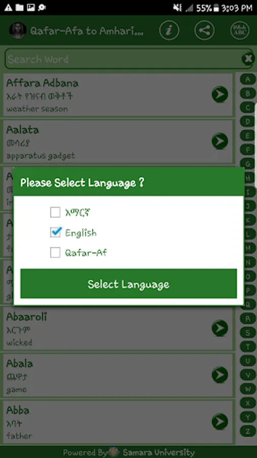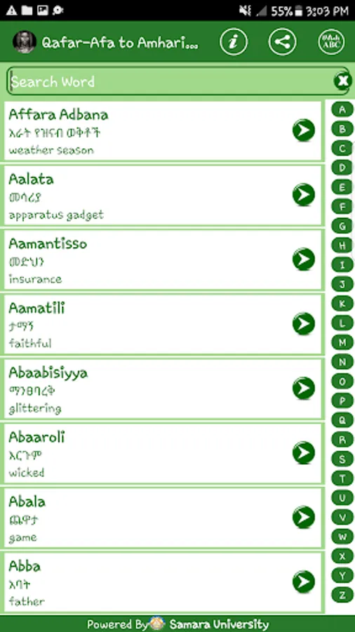 This Android application has more than 1600 Qafar-Af words translation for English and Amharic word. Further more you can copy any words to send or share specific word. This dictionary also support voice for only English words.