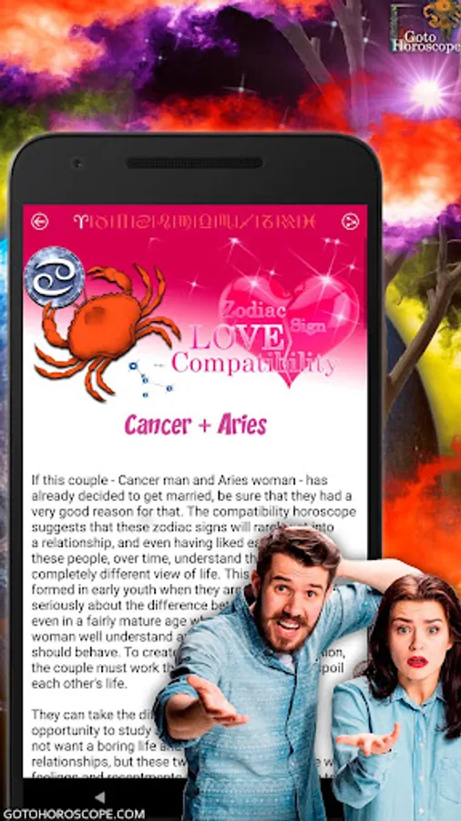 Cancer compatibility horoscope will help you understand your relationships with other Zodiac signs. It also has a cozy design you just need to slide from one Zodiac sign to another. Moreover, at the bottom of each fragment, you could find users comments concerning relationships between Cancer & other Zodiac signs which are helpful for understanding your own connections.