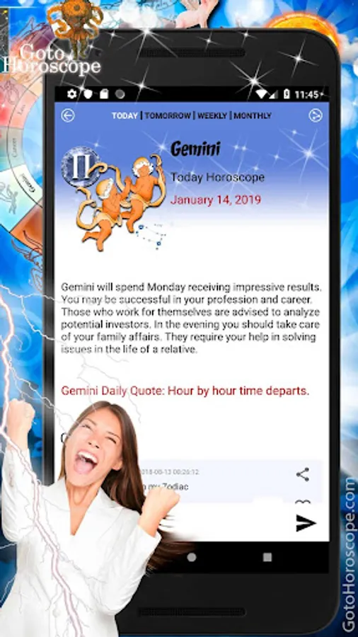 This Gemini Daily Horoscope App has a cozy design and easy to use. Just pick a Daily Horoscope, Yearly forecast or watch the Video Daily Horoscopes for your Zodiac sign Gemini. Here you will find Horoscopes of all kinds but for your Zodiac sign Gemini only. For example, in Daily Horoscope activity, you will find not only Today Horoscope but Tomorrow Horoscope, Weekly & Monthly Horoscope as well, simply slide from one Horoscope to another. In addition, you have the ability to share your experience with other Geminis whether via your favorite messenger or right at the bottom of each page via the build in comments.