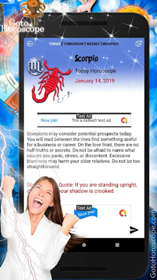 This Scorpio Daily Horoscope App has a cozy design and easy to use. Here you will find Horoscopes of all kinds but for your Zodiac sign Scorpio only. Just pick a Daily Horoscope, Yearly forecast or watch the Video Daily Horoscopes for your Zodiac sign Scorpio. In Daily Horoscope activity, you will find not only Today Horoscope but Tomorrow Horoscope, Weekly & Monthly Horoscope as well, simply slide from one Horoscope to another. In addition, you have the ability to share your experience with other Scorpios whether via your favorite messenger or right at the bottom of each page via the build in comments.