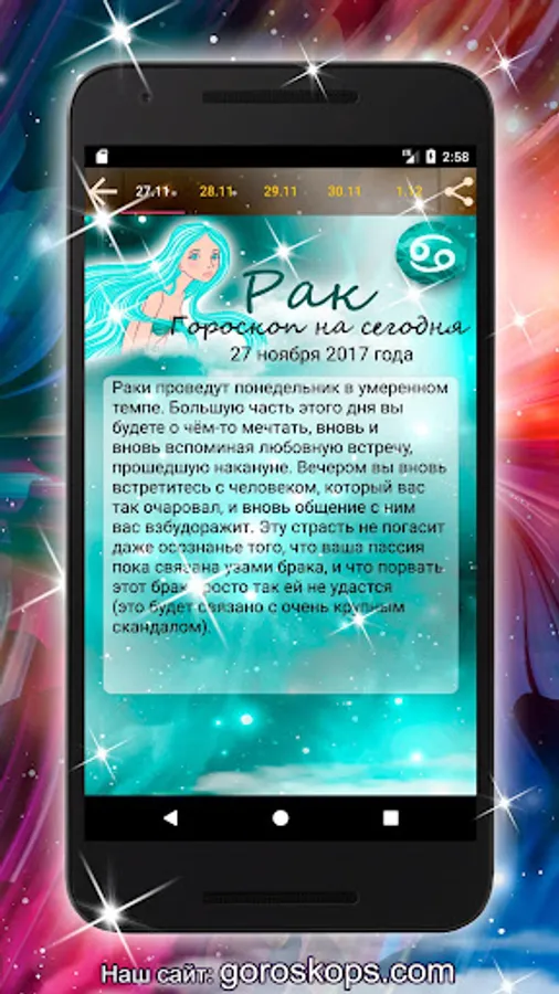 Daily horoscopes, as a rule, limit us to information for two or three days. Our application allows Cancers to look five days ahead, which will contribute to long-term planning. The horoscope of the day is updated in real time, which means you don't have to waste time looking for information that is relevant for the current day.