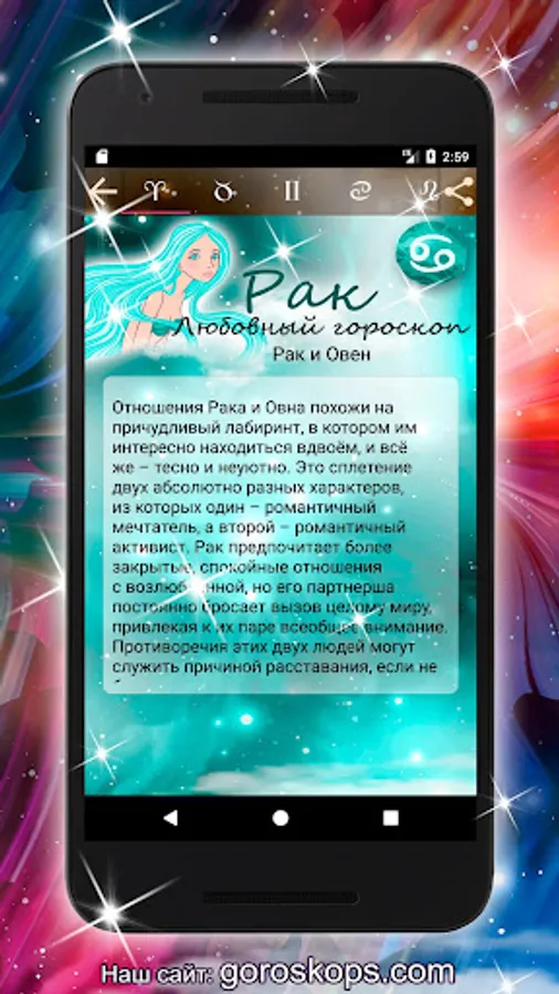 We have no doubt that you will appreciate the bright, eye-pleasing design of our application. Many will like such a useful option as a video horoscope. Let all this lift your spirits, instill optimism in you and make life more harmonious.