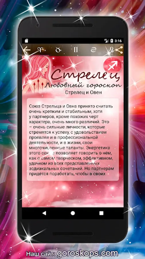 Sagittarius are subtle connoisseurs of beauty, and you will surely appreciate the striking design of our application. We are sure that you will not leave such a useful option as horoscopes on video out of your zone of interest. We hope that all this will add a positive tone to your day and, therefore, attract good luck to you.