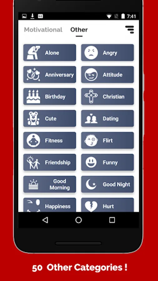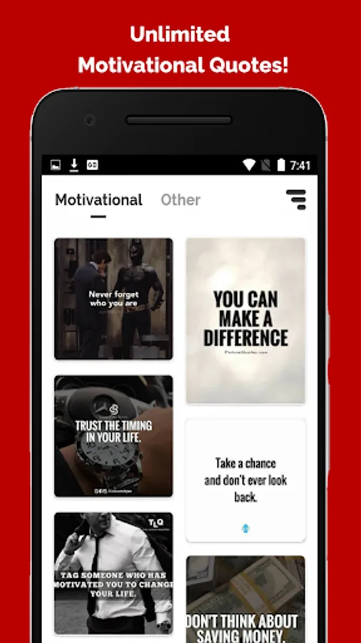 This app contains 50000 plus Motivational, Inspirational and Success Quotes that starts your day with motivation.