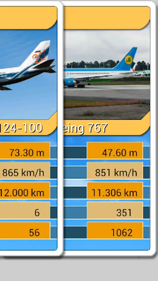 Airplanes-Quartet is a super-trump/top trumps/mega-trump quartet card game. It consists of 32 cards, each has 5 attributes: