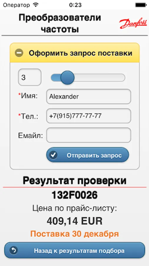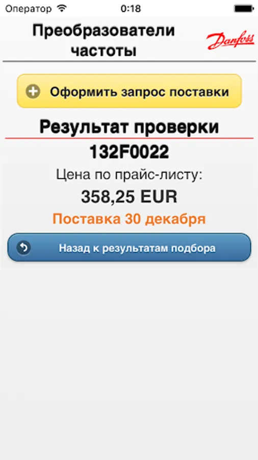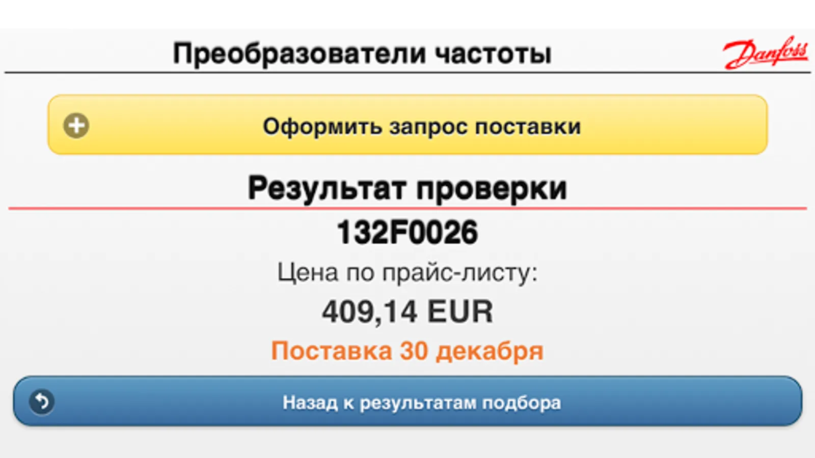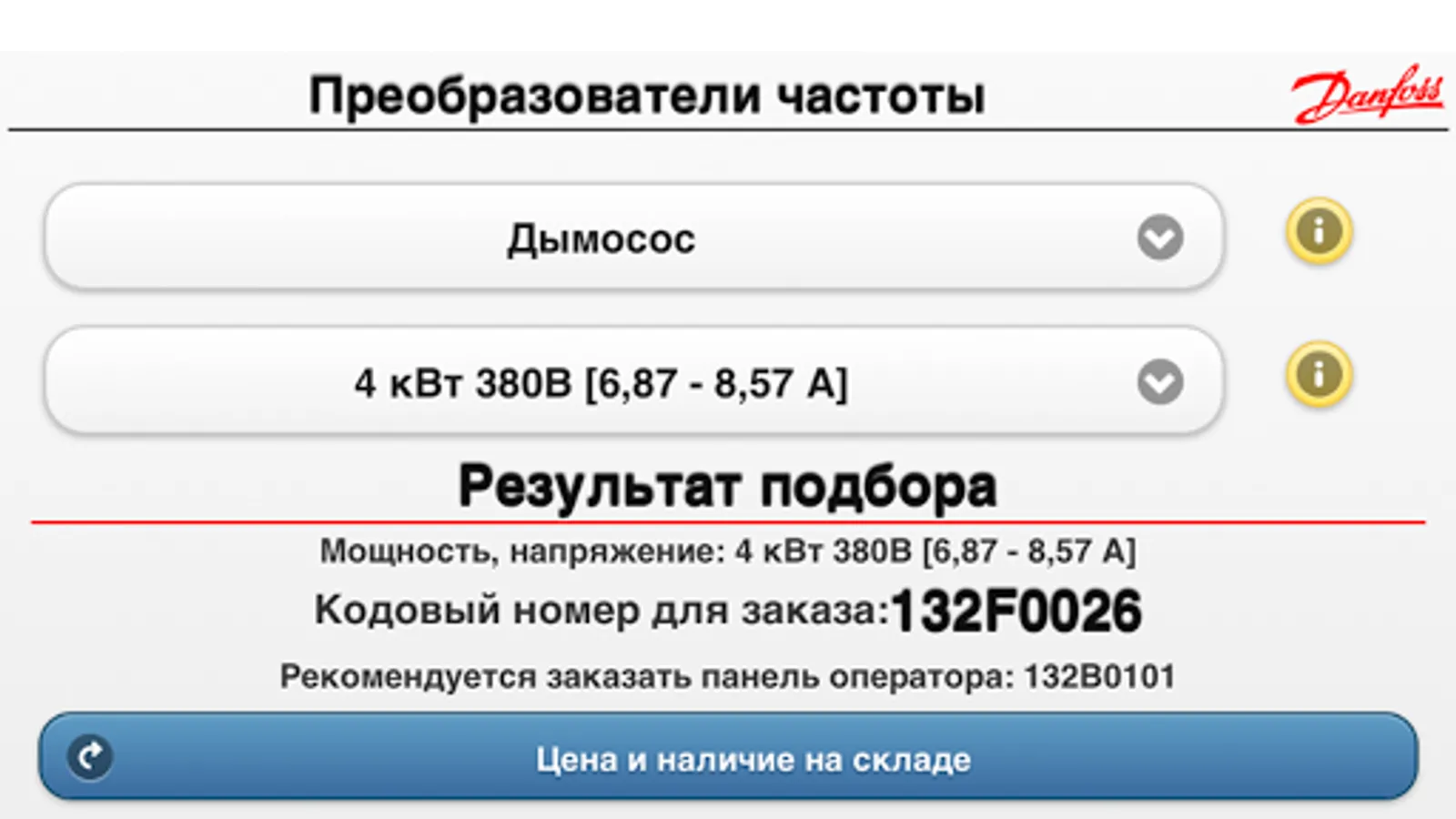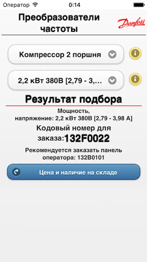 The program "Configurator frequency converters Danfoss' allows a two step process to choose the frequency inverters for simple applications such as fans, exhaust fans, centrifugal pumps, piston pump, screw compressor, piston compressor. You only need to select the type of application and indicate current / voltage / power of your engine. Using the software, you can get a customized code of the frequency converter, its retail price and get to know the availability of the selected equipment in the warehouse in Moscow.