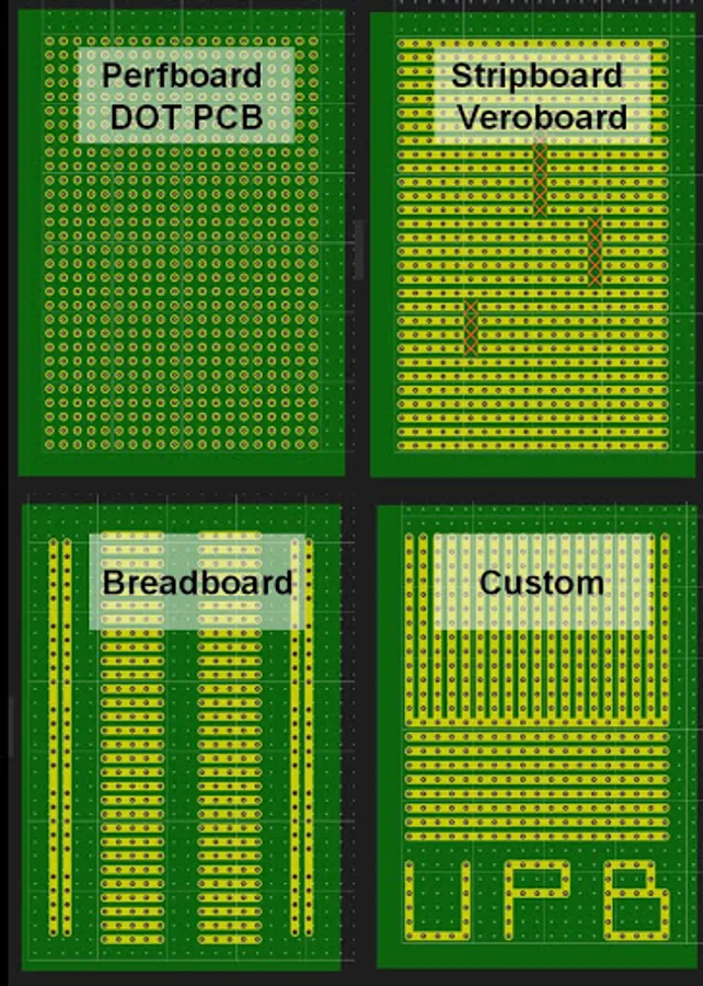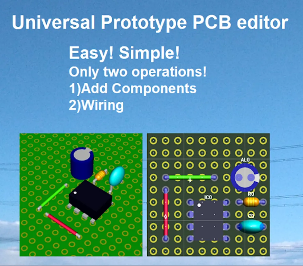 It is an application that designs a universal print circuit board(Perfboard, DOT PCB, Protoboard, Stripboard, Veroboard, Solderless breadboard, Plugboard) for electronic work as a hobby.