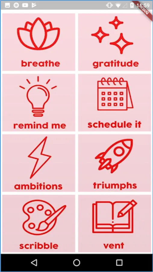 This app has a bunch features. You can use the app to: (1) practice a mediation session (2 mins, 5 mins, 10 mins), (2) write 5 reminders, (3) write 5 goals, (4) write 5 achievement notes, (5) write a diary.