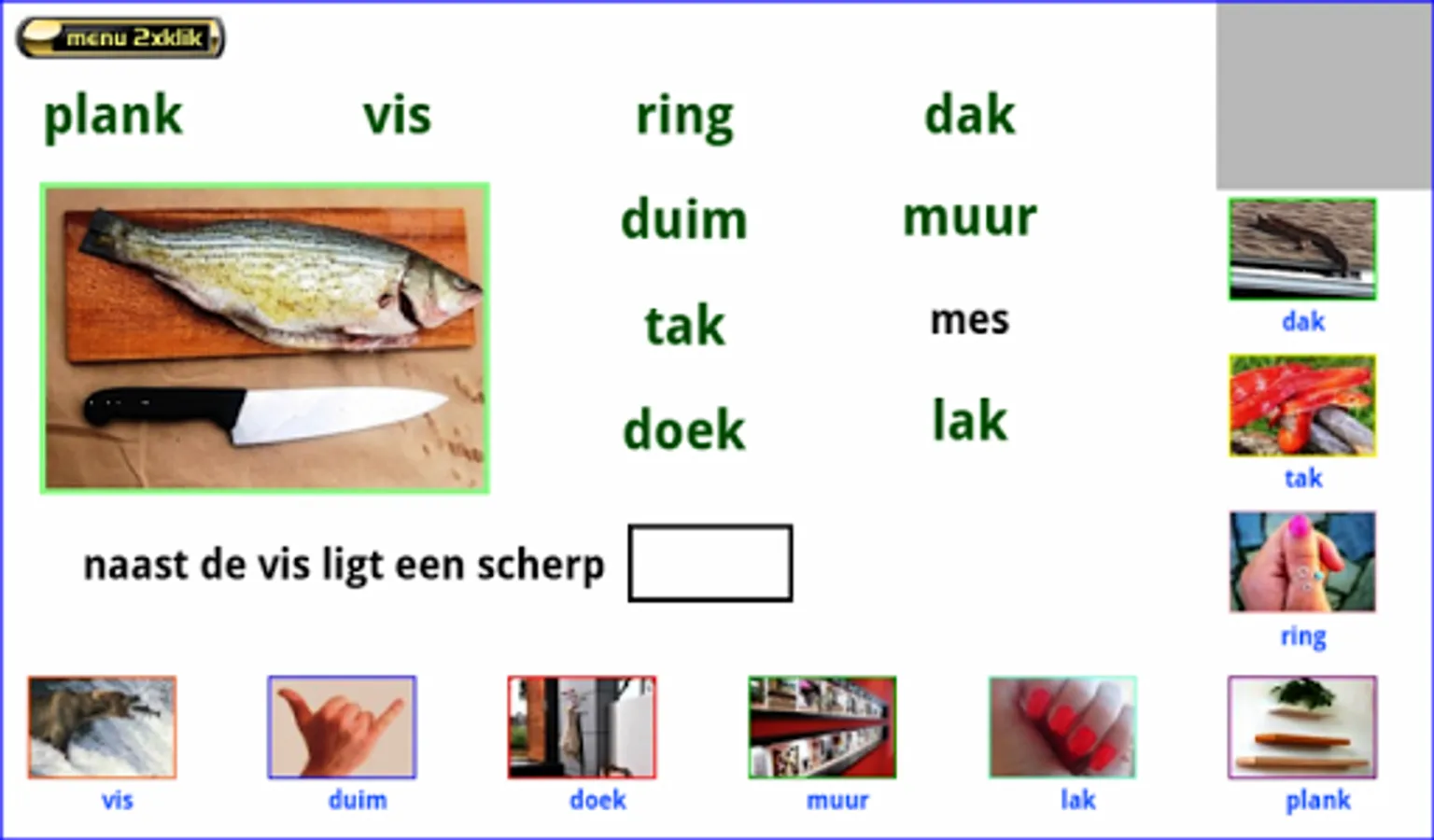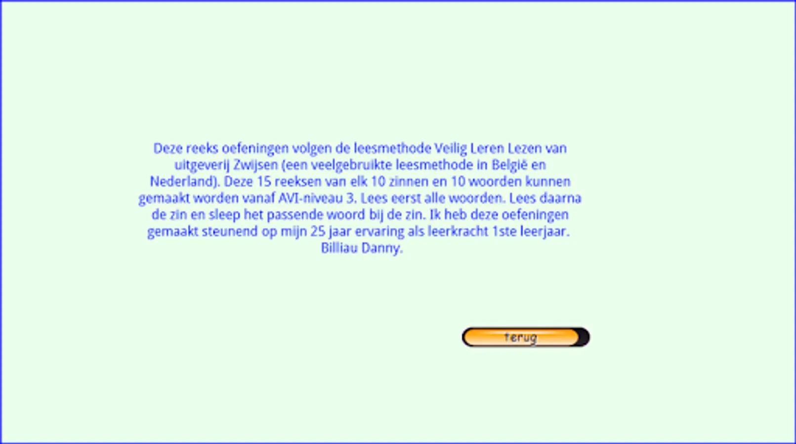 This series of exercises follow the reading method safely learn to read of publishing Zwijsen (a widely used reading method in Belgium and the Netherlands). These 15 sets each of 10 sentences and 10 words can be created from AVI level 3. Please read all the words. Then read the sentence and drag the appropriate word in the sentence. I made these exercises relying on my 25 years experience as a teacher 1st grade. Works best on tablets. Not suitable for smartphones. Danny Billiau