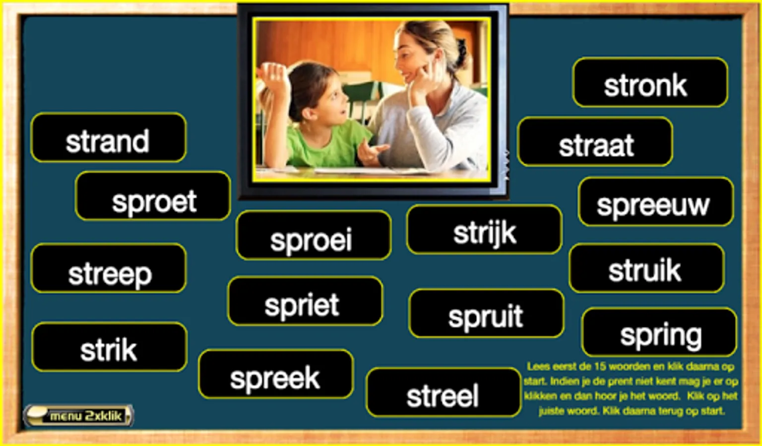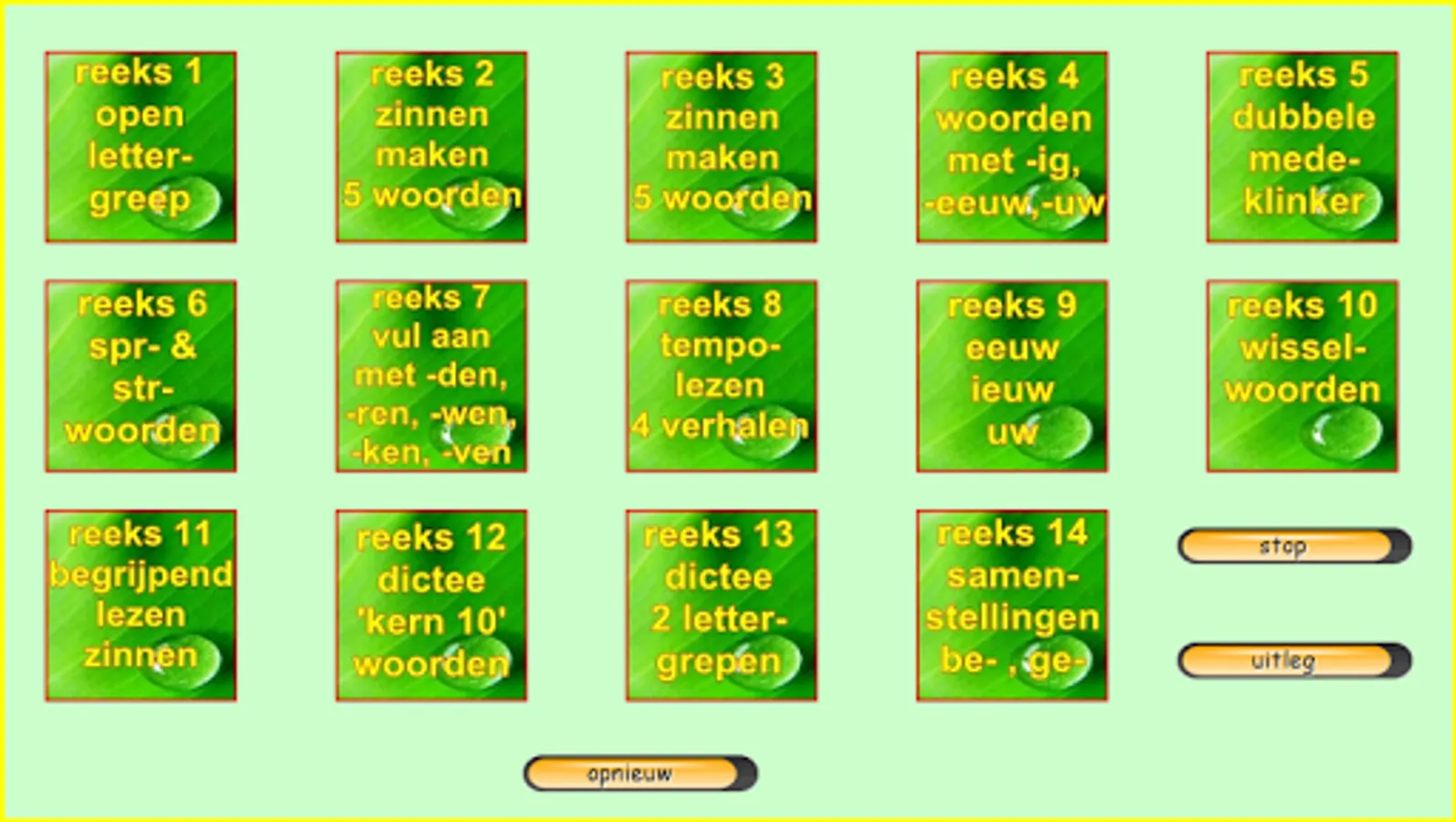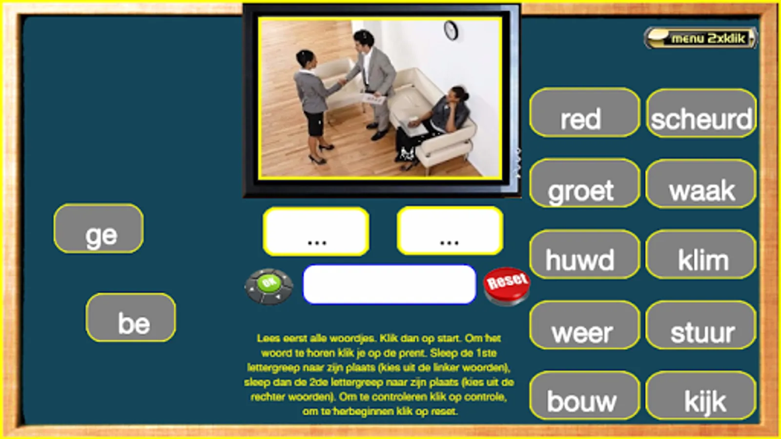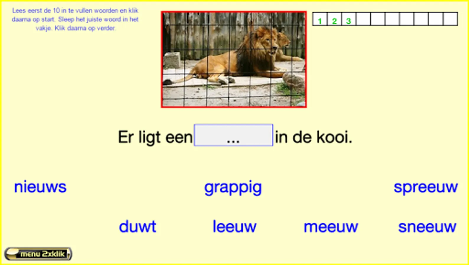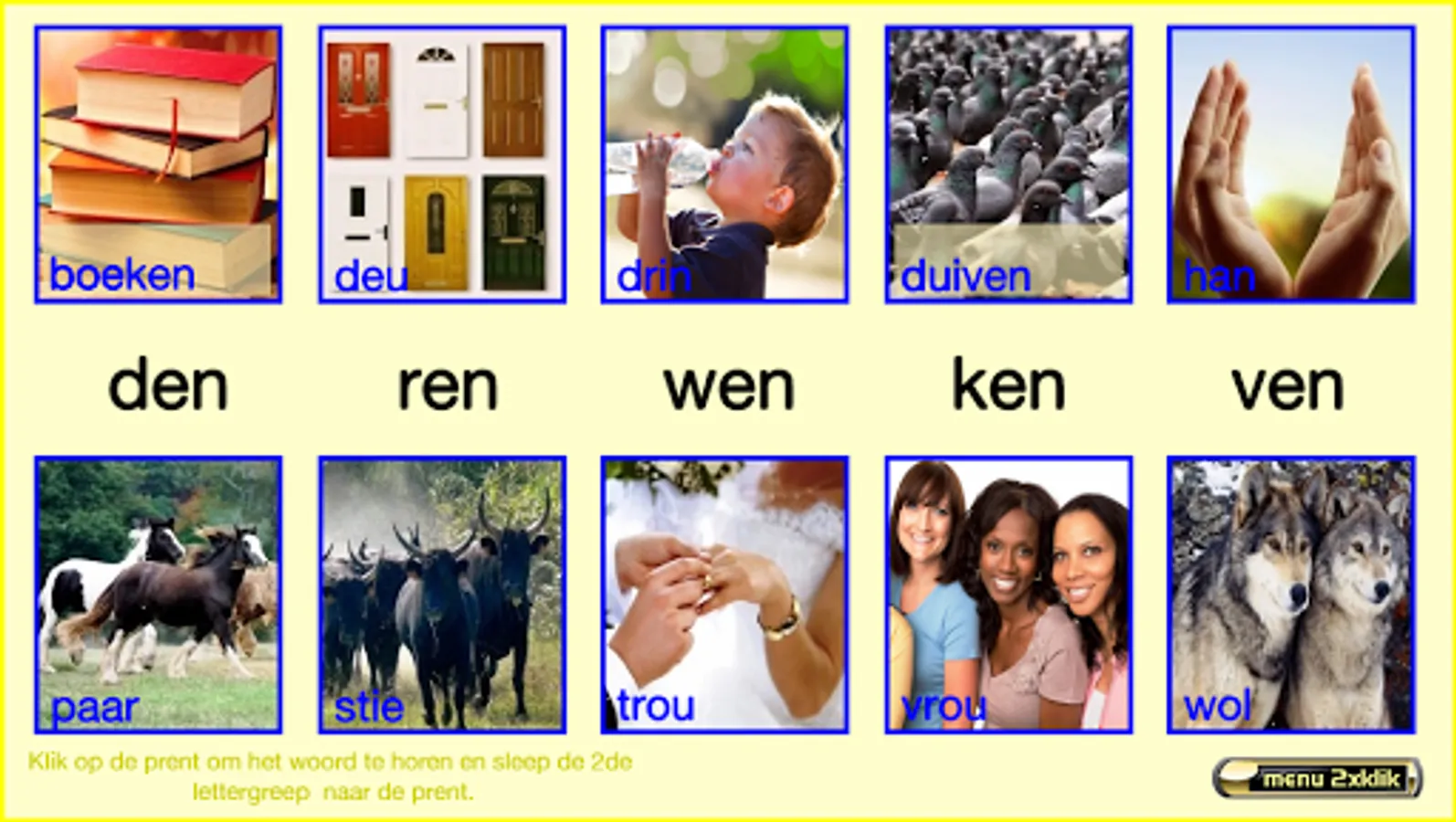 This series of exercises follow the reading method safely learn to read of publishing Zwijsen (a widely used reading method in Belgium and the Netherlands). The exercises follow the lunar 2nd version and the version horizon. In core 10 children mainly learn words with two syllables such as "ta-pijt, bu-der, ball-len ... '. Even words 'ew, and -your-Century' are practiced. They also meet with an open syllable words such as "Va-der, ko-pen ... '. I made these exercises relying on my 25 years experience as a teacher 1st grade. Most exercises are supported both visually and aurally. Headphones make the sound even better. Works best on tablets. Billiau Danny.