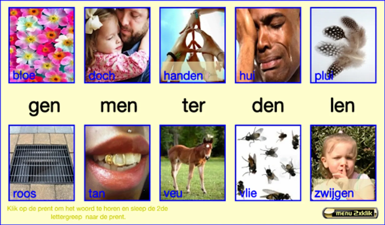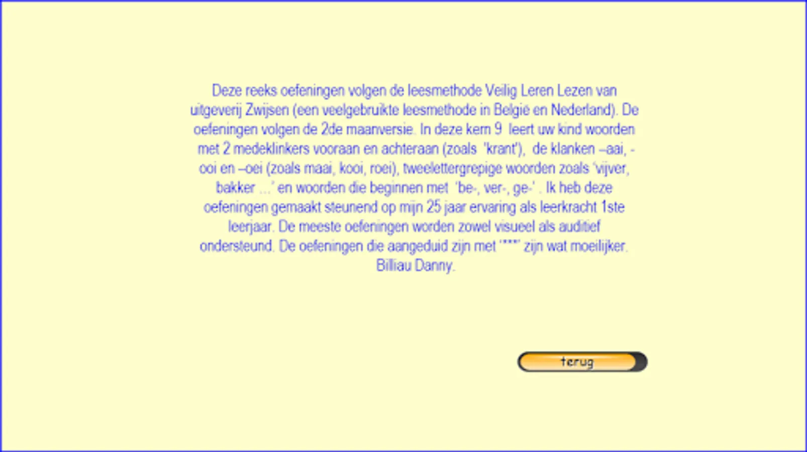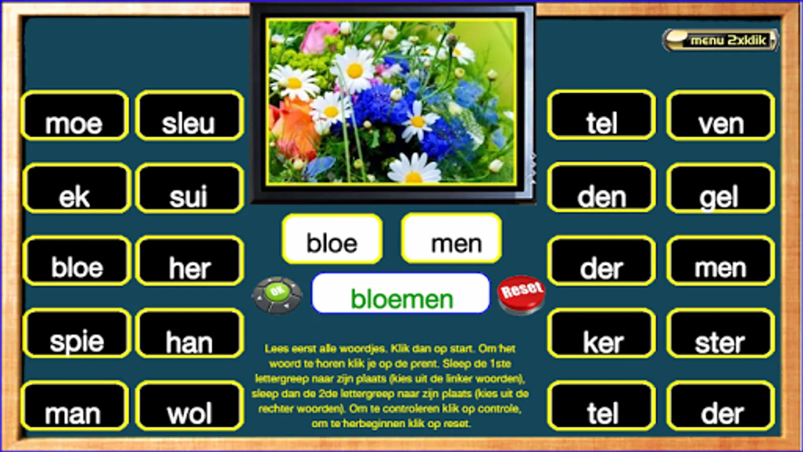 This series of exercises follow the reading method safely learn to read of publishing Zwijsen (a widely used reading method in Belgium and the Netherlands). The exercises follow the lunar 2nd version and the version horizon. This core 9 teach your child words with two consonants in front and back (such as newspaper), the sounds cuddle, -ewe and oops (like cutting cage, rowing), two-syllable words like "pond, bakery ..." and words that begin with "working be built, GE '. I made these exercises relying on my 25 years experience as a teacher 1st grade. Most exercises are supported both visually and aurally. The exercises are marked with "***" are more difficult. Most exercises are supported both visually and aurally. Headphones make the sound even better. Works best on tablets. Billiau Danny.