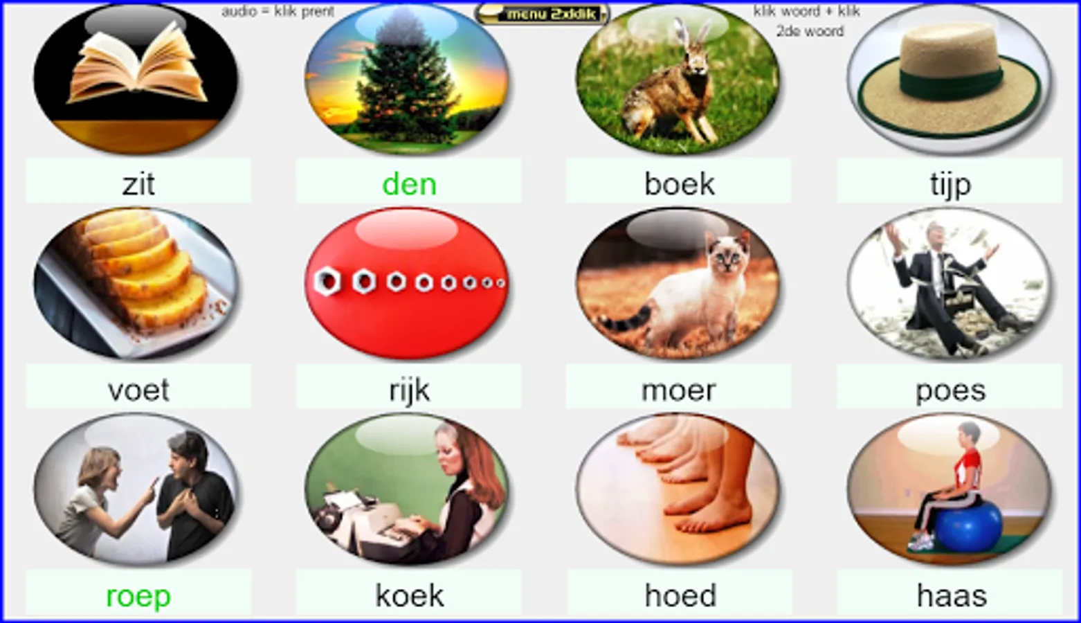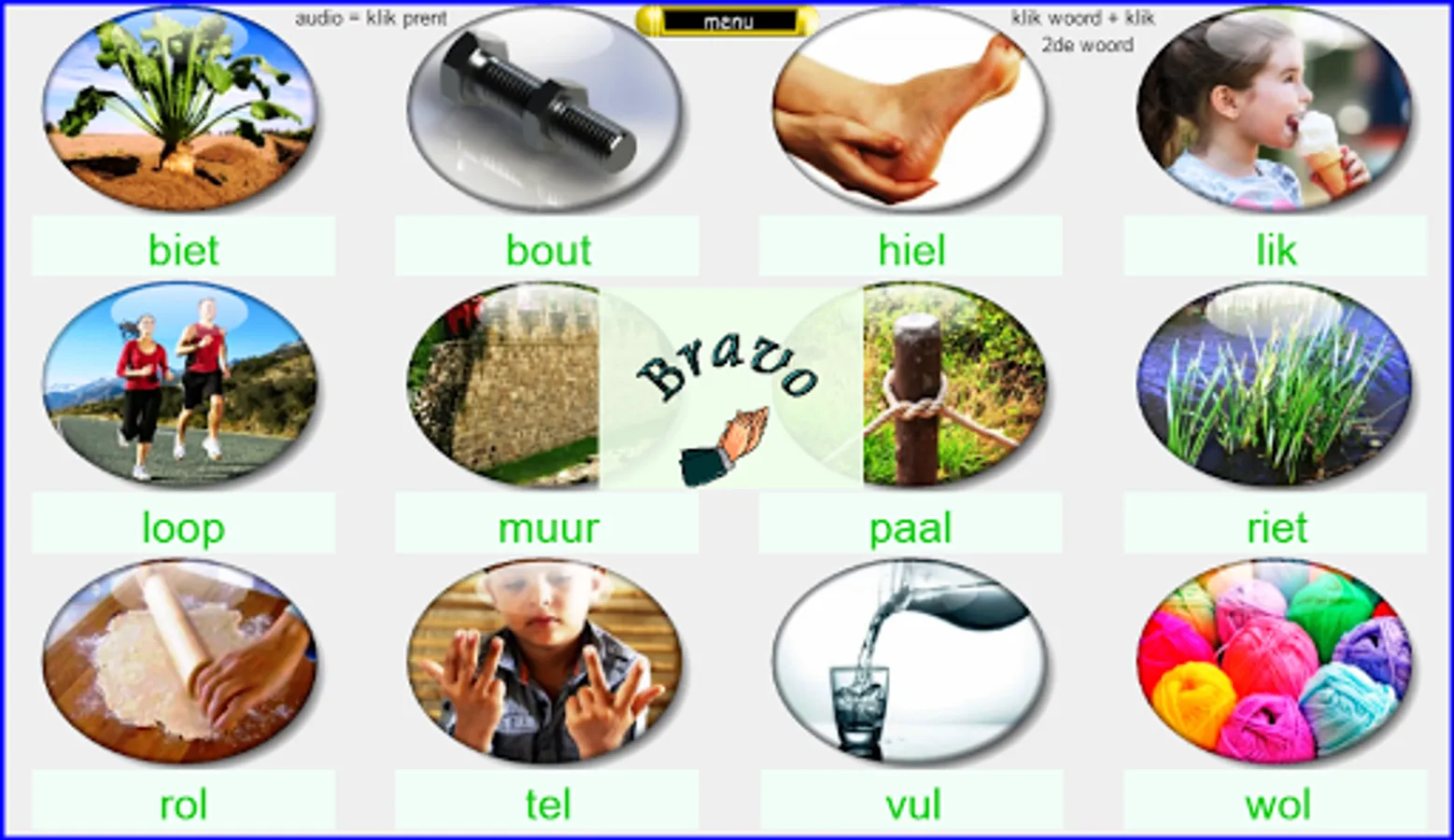 This reading and vocabulary exercises are based on the reading method safely learn to read Kim version. This app contains 35 sets each with 12 words so 420 words divided into 11 cores. From easter Kim this version can also be easily used by ordinary users of Safe Learning Reading version. I've created these exercises relying on my 25 years experience as a teacher, 1st grade. All exercises are supported both visual and auditory. Headphones make the sound even better. Works best on tablets. Not suitable for smartphones. Black screen = charging time (+/- 50 sec) .start somewhat quicker at next use. Billiau Danny.