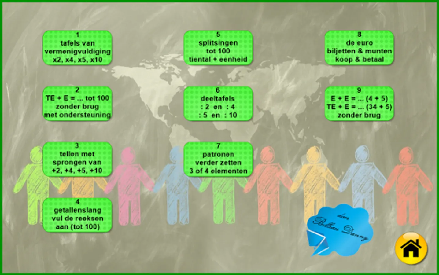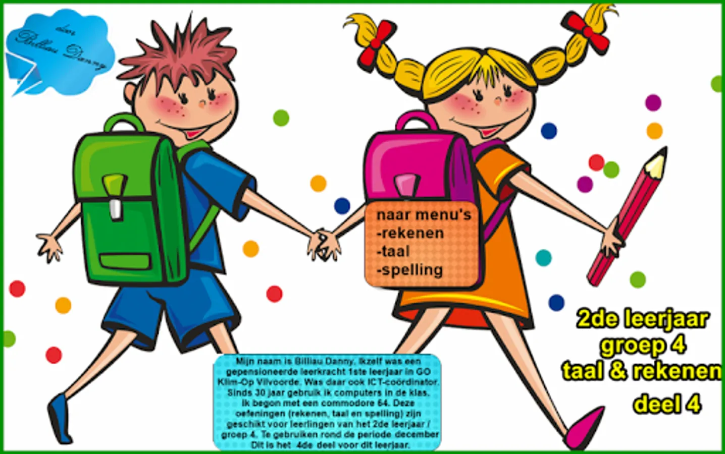 My name is Danny Billiau. I myself am a retired teacher in 1st grade GO Klim-Op Vilvoorde. Was there ICT coordinator. For 30 years, I use computers in the classroom. I started with a Commodore 64. These exercises (math, language and spelling) are suitable for students in 2nd grade / group 4. Use round from December. This is the 4th part of this year.