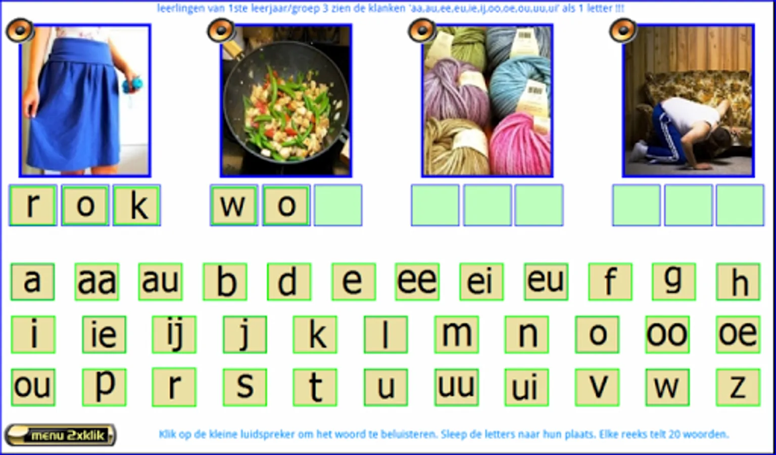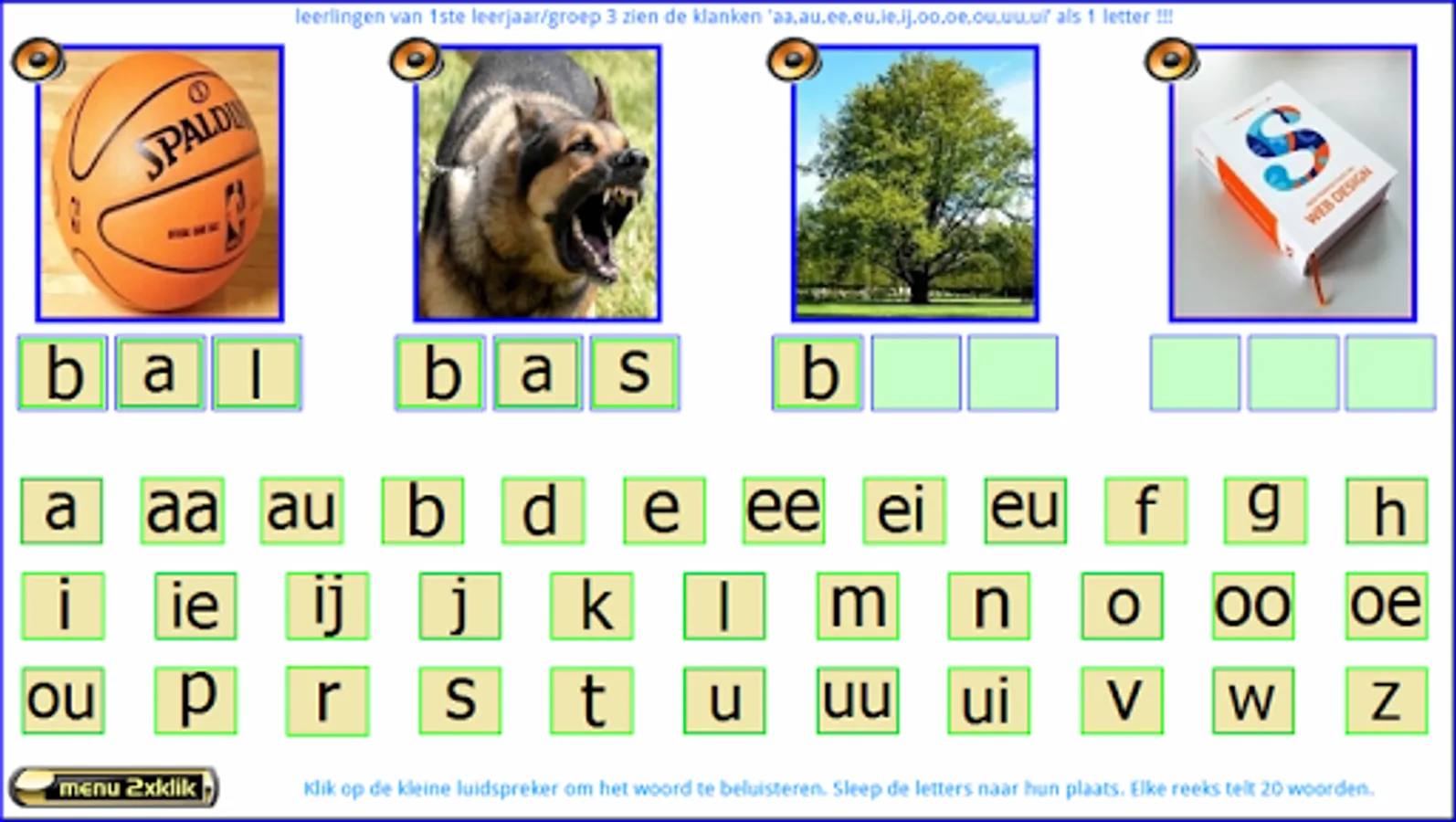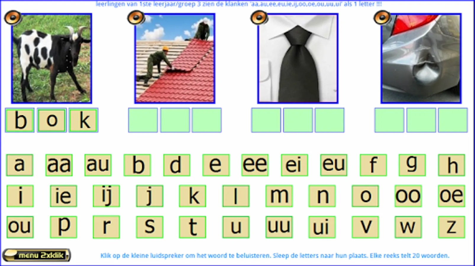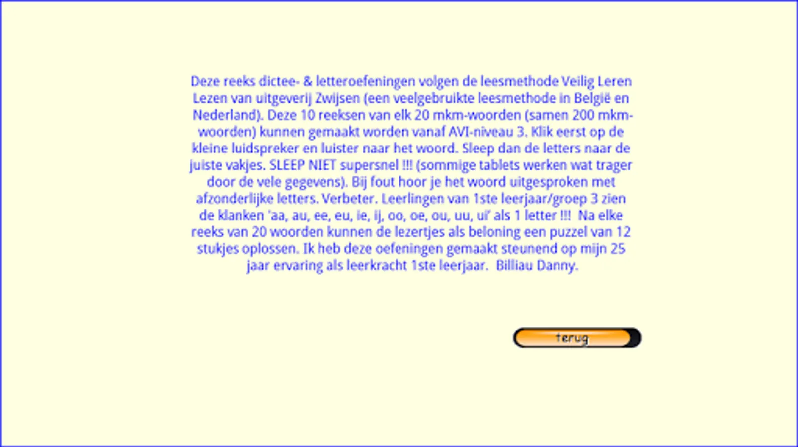 This series of dictation & letter exercises follow the reading method Safe Learning to Read from Zwijsen publishers (a widely used reading method in Belgium and the Netherlands). These 10 sets of 20 mkm words each (together 200 mkm words) can be made from AVI level 3. First click on the small speaker and listen to the word. Then drag the letters to the correct boxes. DO NOT DRAG super fast!!! (some tablets work a bit slower due to the large amount of data). If you make a mistake, you will hear the word pronounced with individual letters. Improve. Students of 1st grade/group 3 see the sounds 'aa, au, ee, eu, ie, ij, oo, oe, ou, uu, ui' as 1 letter!!! After each series of 20 words, the readers can solve a puzzle of 12 pieces as a reward. I made these exercises based on my 25 years of experience as a 1st grade teacher. Lots of auditory and visual support. Headphones make the sound even better. Works best on tablets. Not so suitable for smartphones.