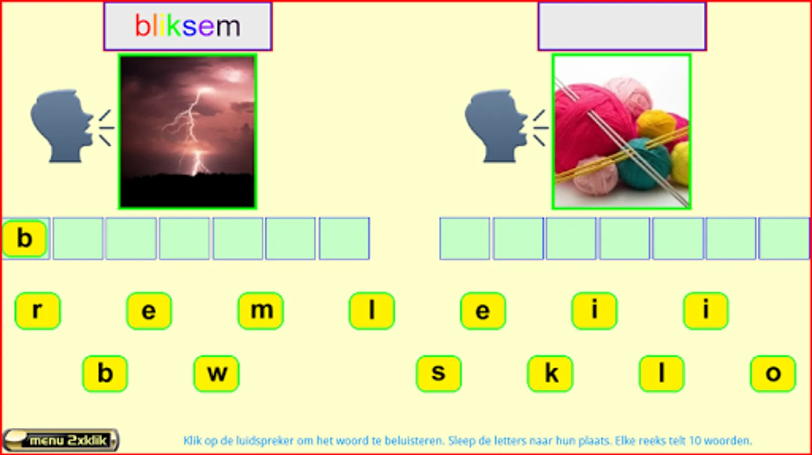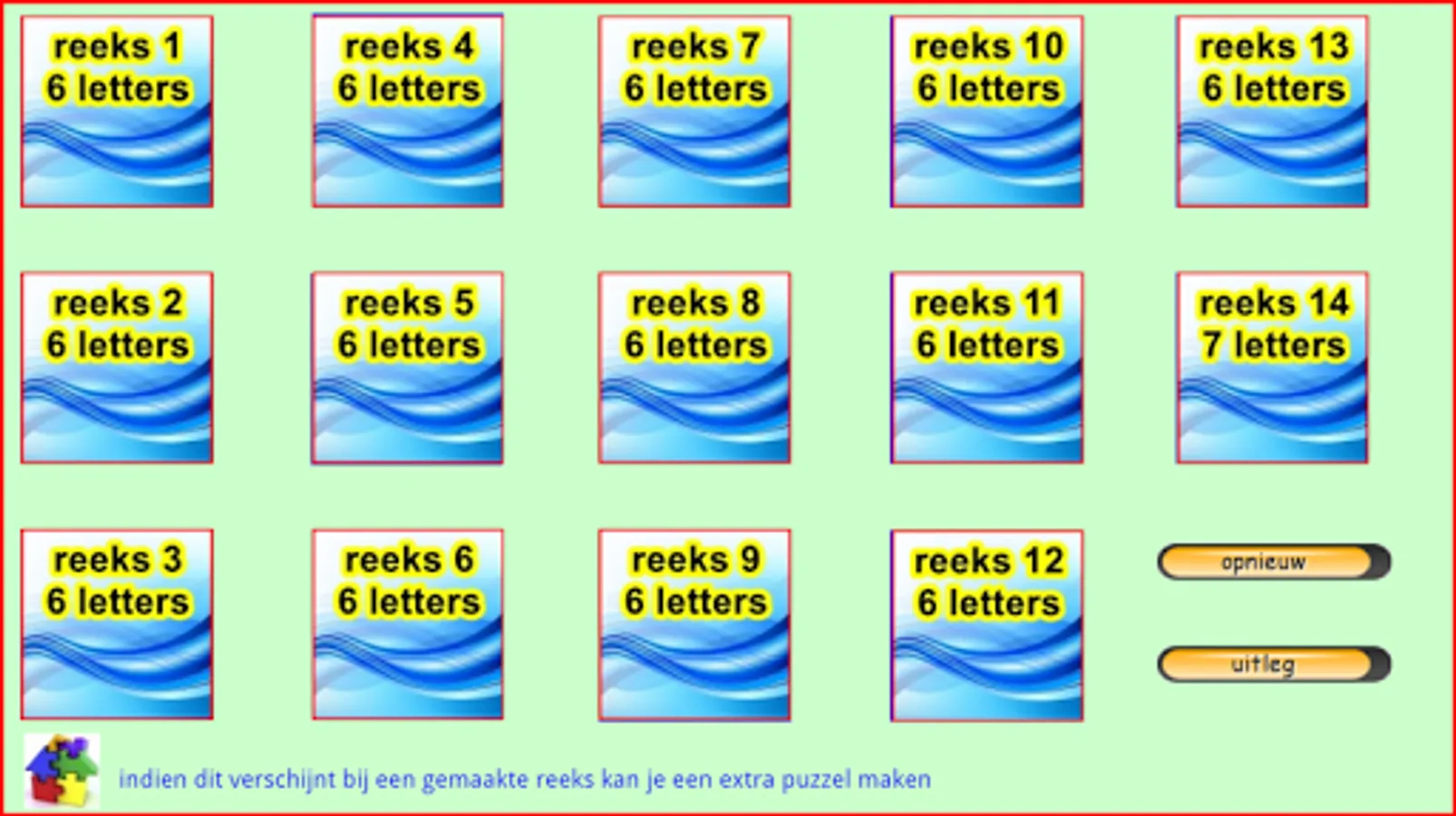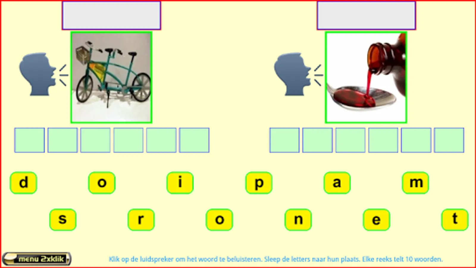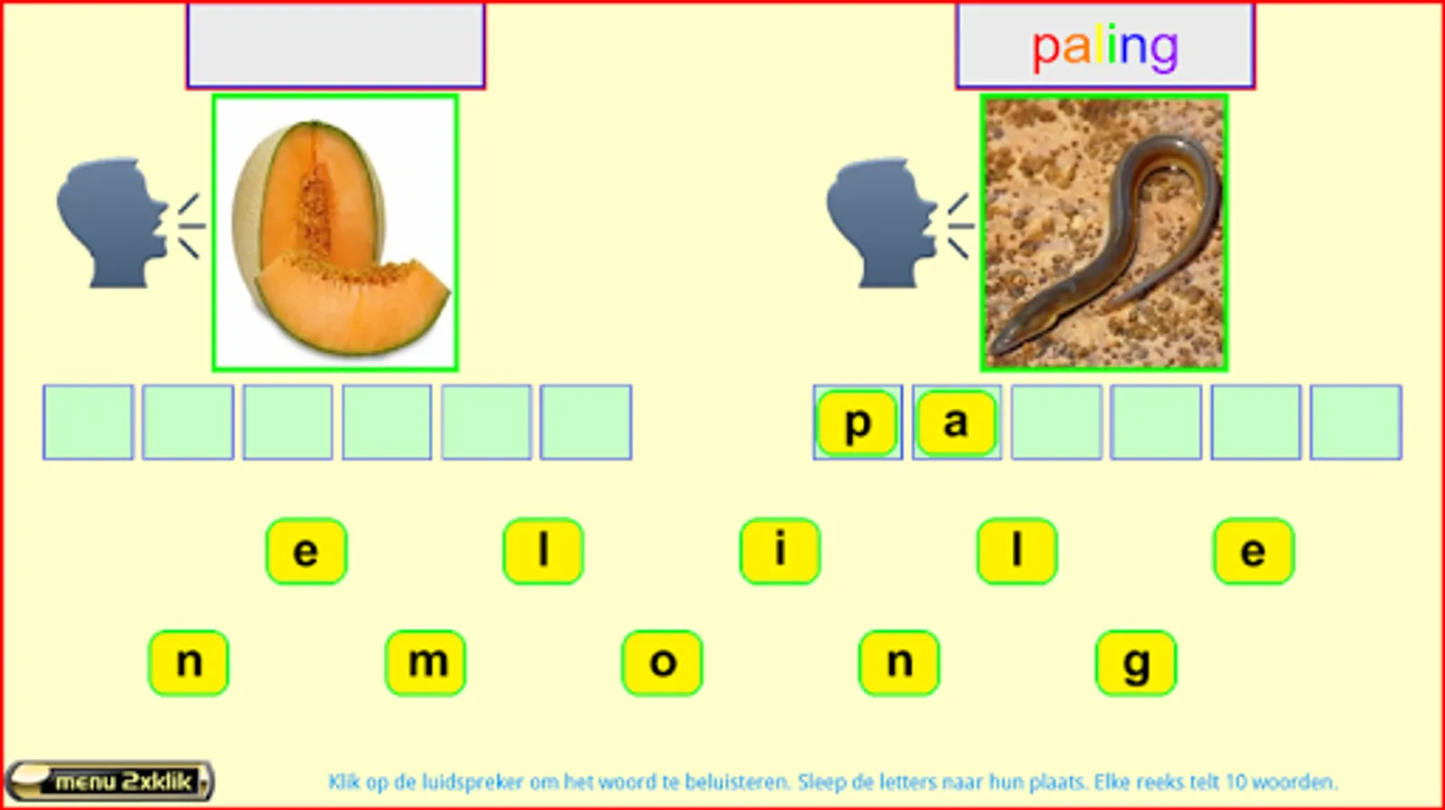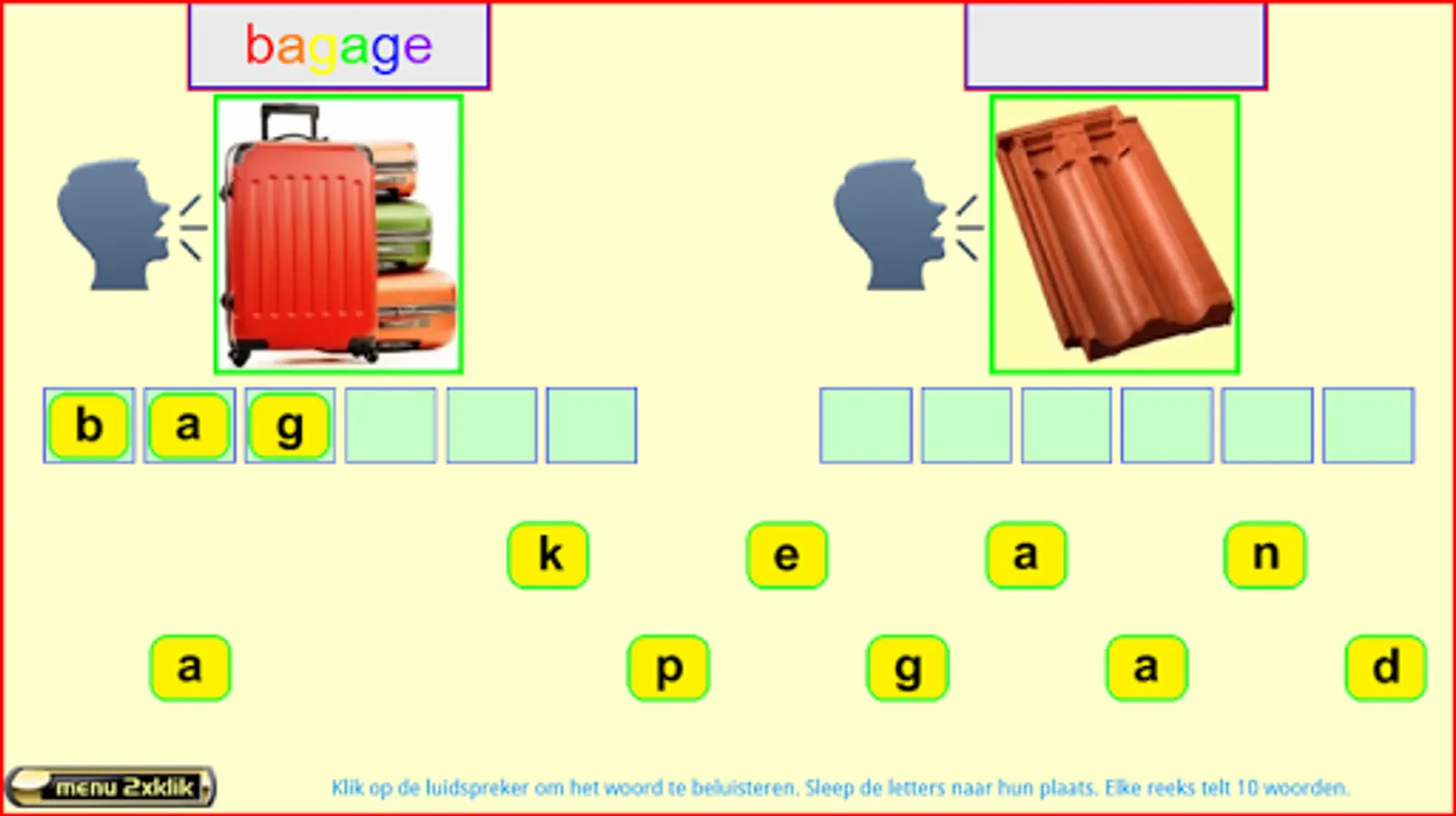 This series of dictation & letter exercises follow the reading method Safe Learning to Read from Zwijsen publishers (a widely used reading method in Belgium and the Netherlands). These 14 sets of 10 polysyllabic words each (together 140 words – 850 letters) can be made from AVI level 3. First click on the speaker and listen to the word. Then drag the letters to the correct boxes. DO NOT DRAG super fast!!! (some tablets work a bit slower due to the large amount of data). In case of error you will see the word in color with individual letters. Improve. Students of 1st grade/group 3 see here the sounds 'aa, au, ee, eu, ie, ij, oo, oe, ou, uu, ui' as separate letters!!! After each series of 10 words, the readers can solve a puzzle of 12 pieces as a reward.