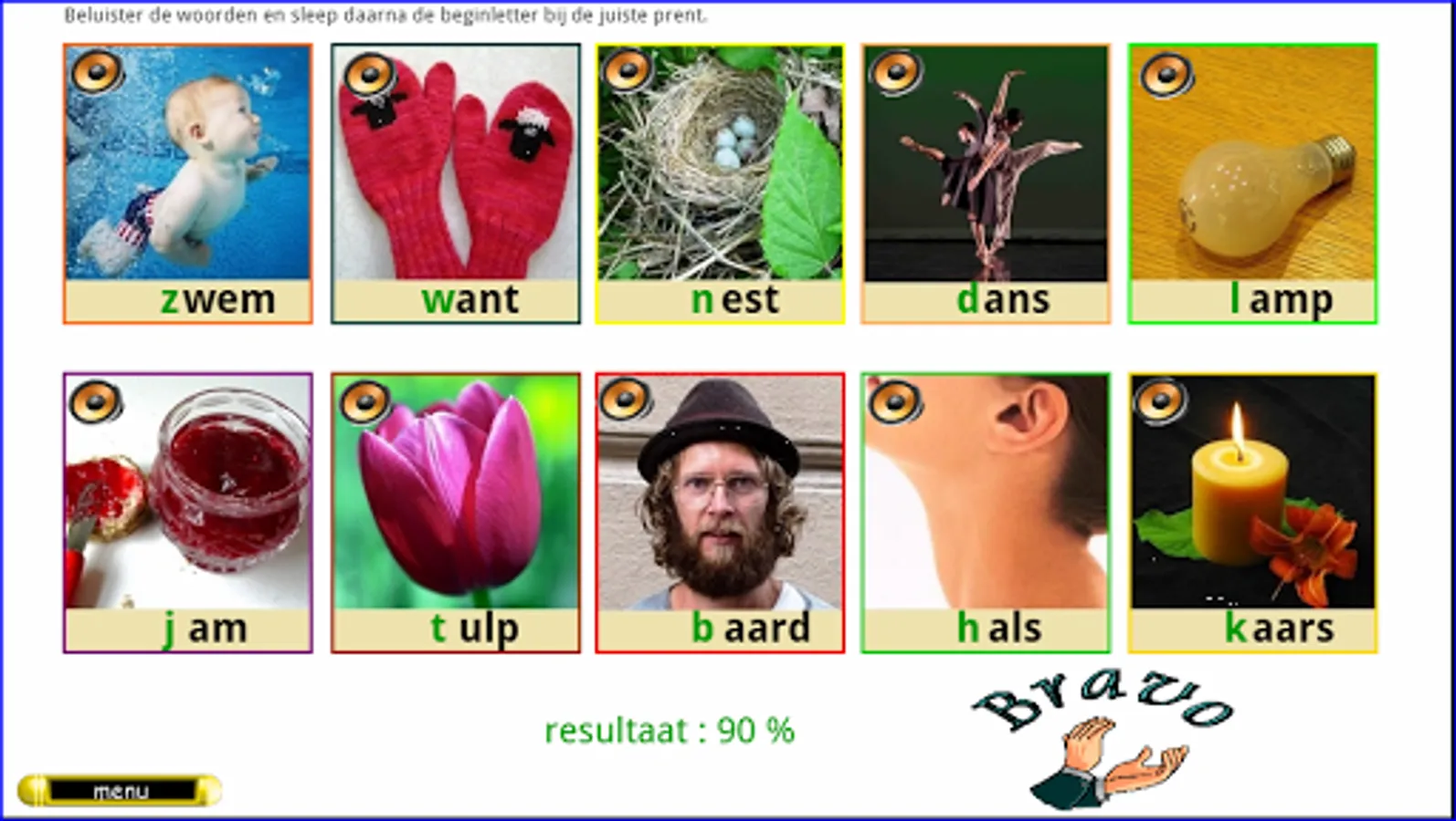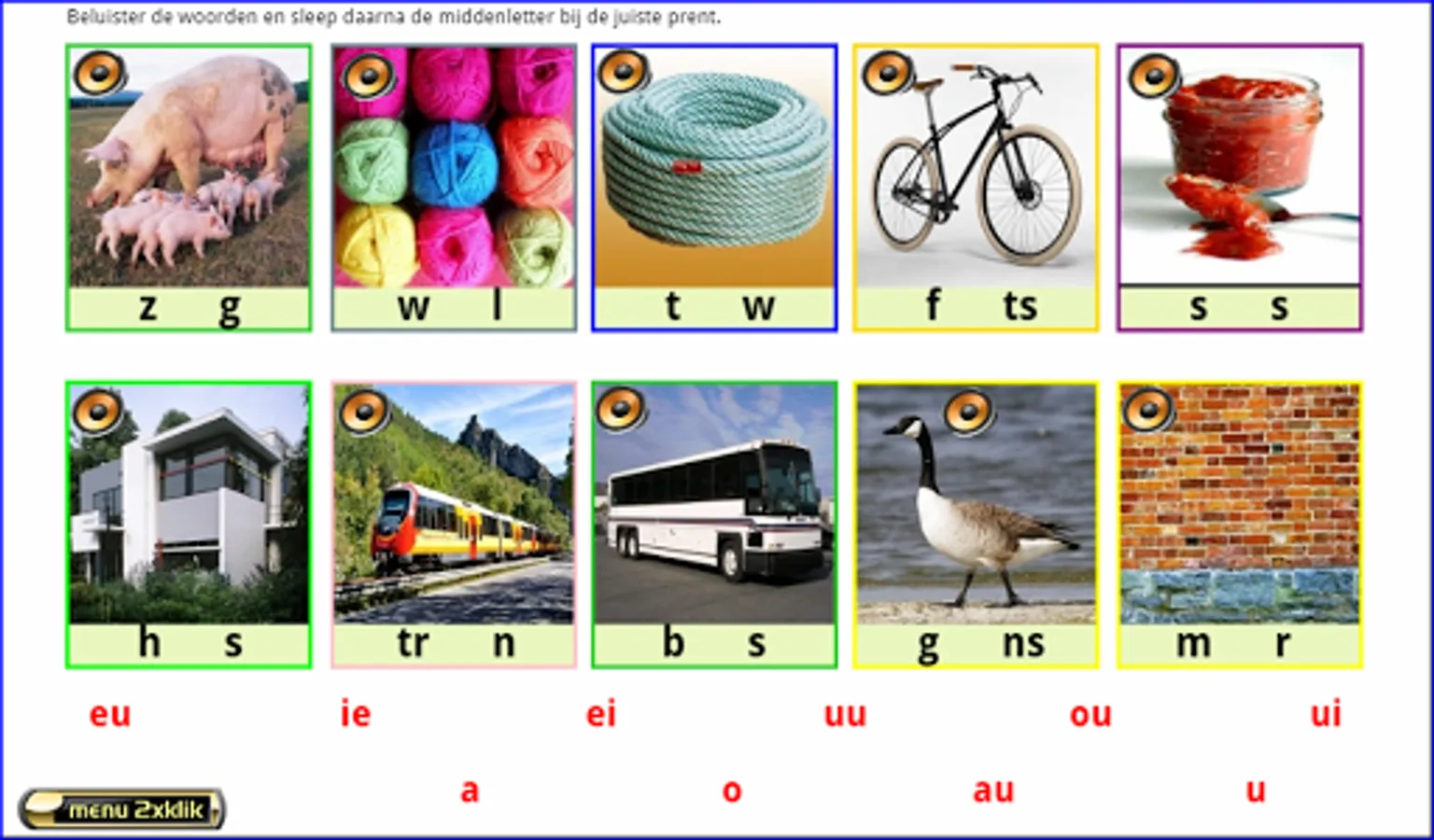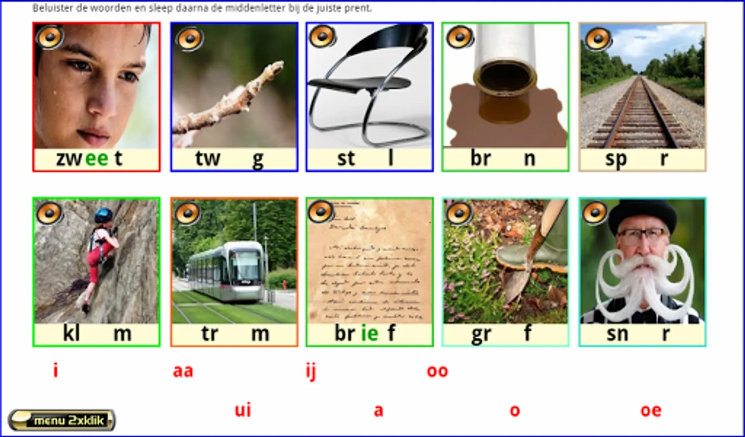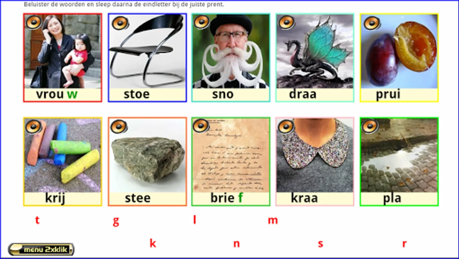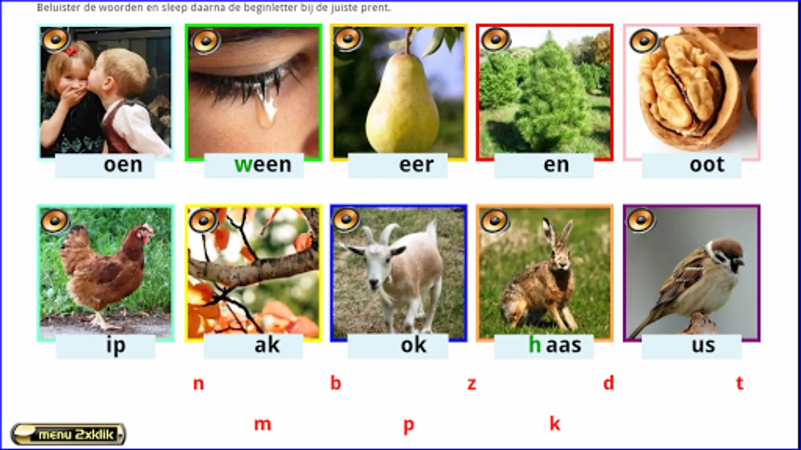 This series of exercises follows the reading method Safe Learning to Read from Zwijsen publishers (a widely used reading method in Belgium and the Netherlands). These 16 series of 10 words and 10 letters each can be made from AVI level 3. First listen to all the words by clicking on the loudspeakers. Drag the letters to the correct pictures. Enter the beginning, middle, or ending sound.