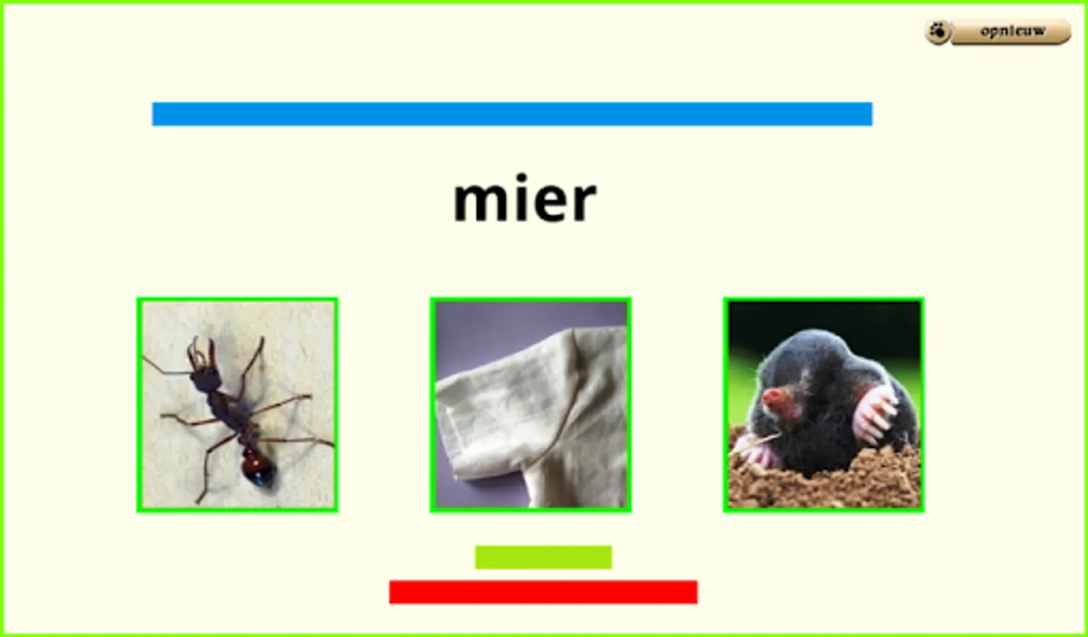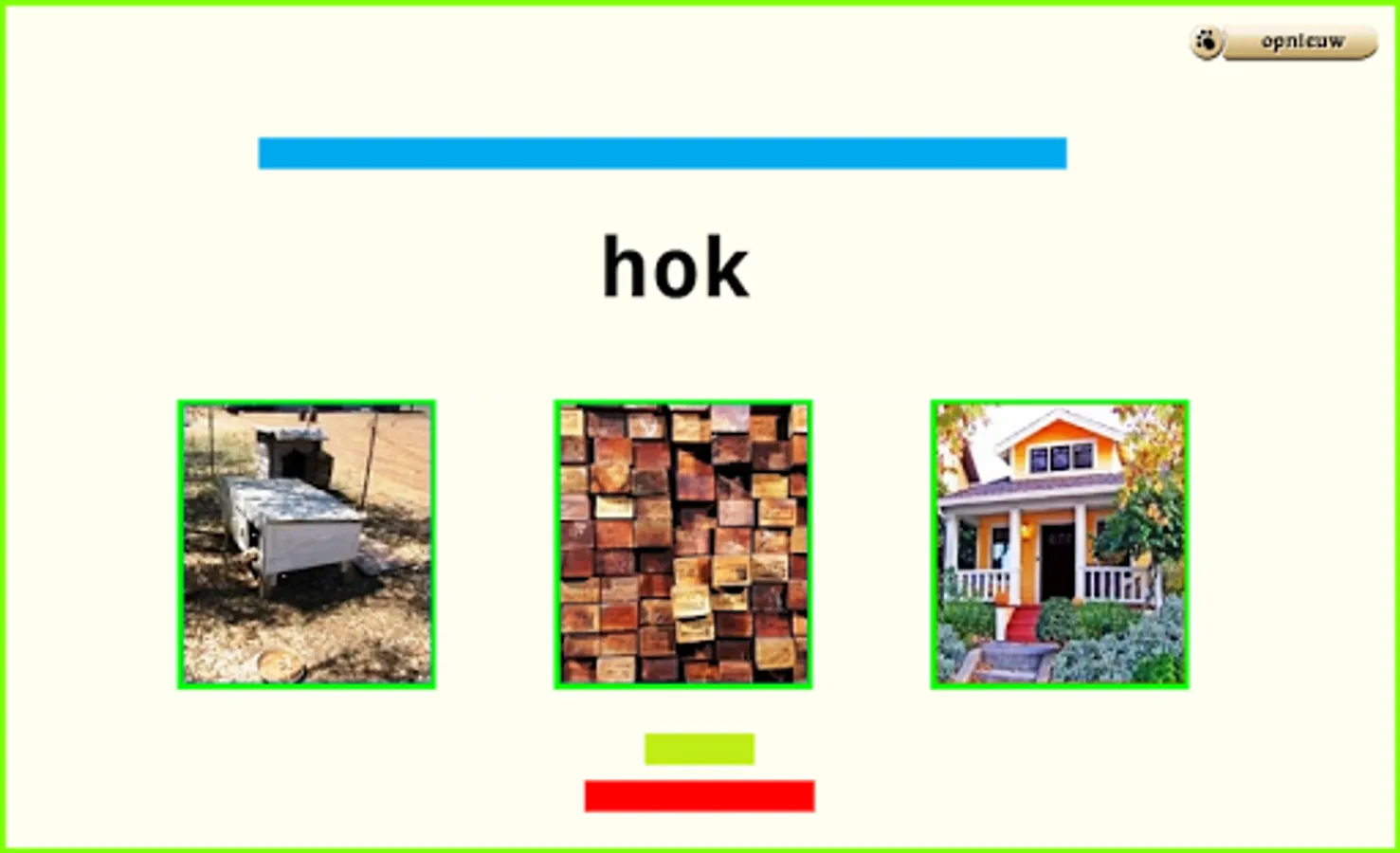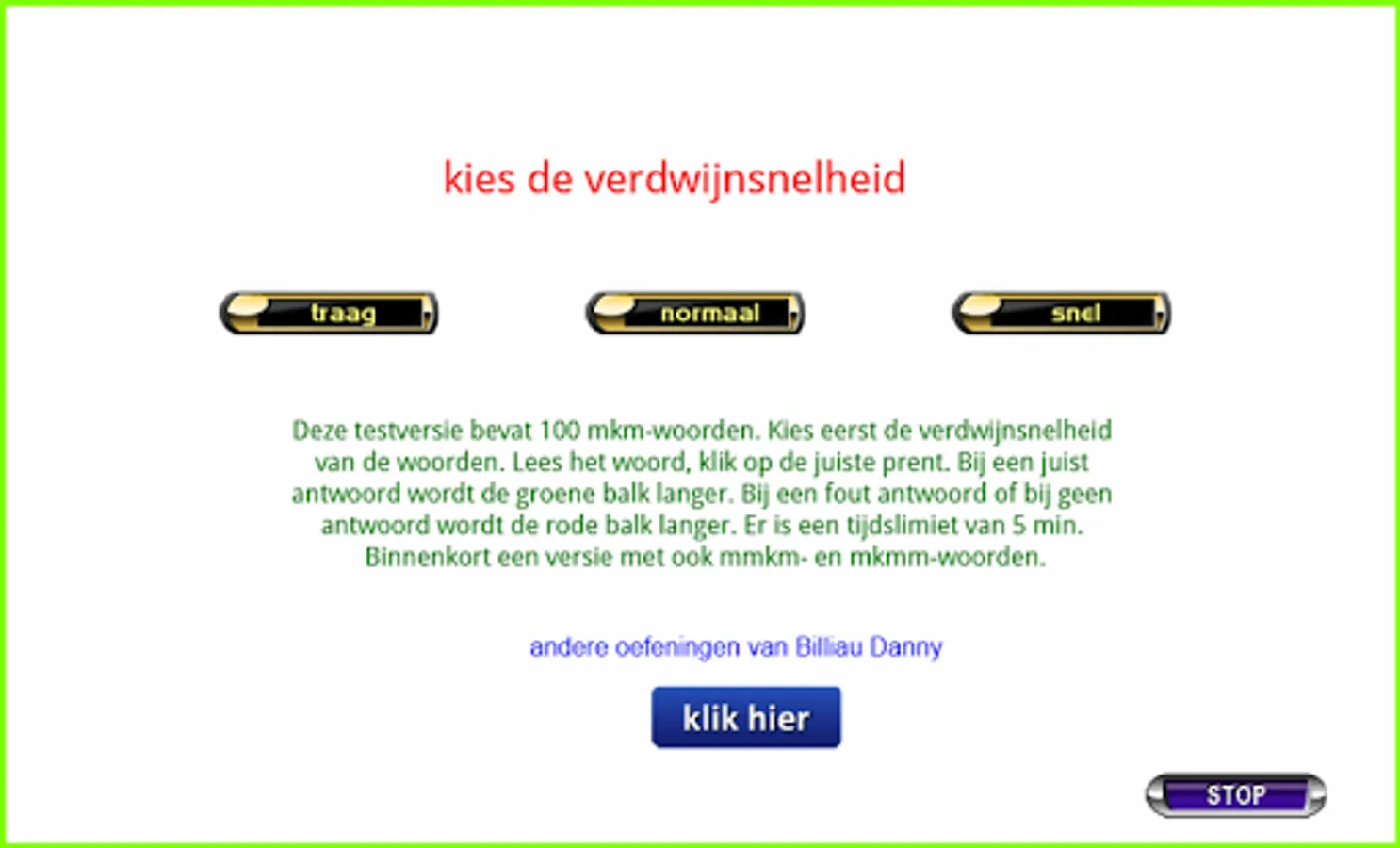 Being able to read 100 mkm words. Exercise for beginning readers 1st grade/group 3. Choice of 3 speeds. Exercise ends automatically after 5 min. Result on the end page. This app runs best on tablets, less suitable for smartphones. Method: choose pace, read the word, click on 1 of the 3 pictures. Works best on tablets.