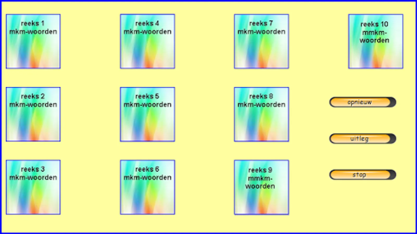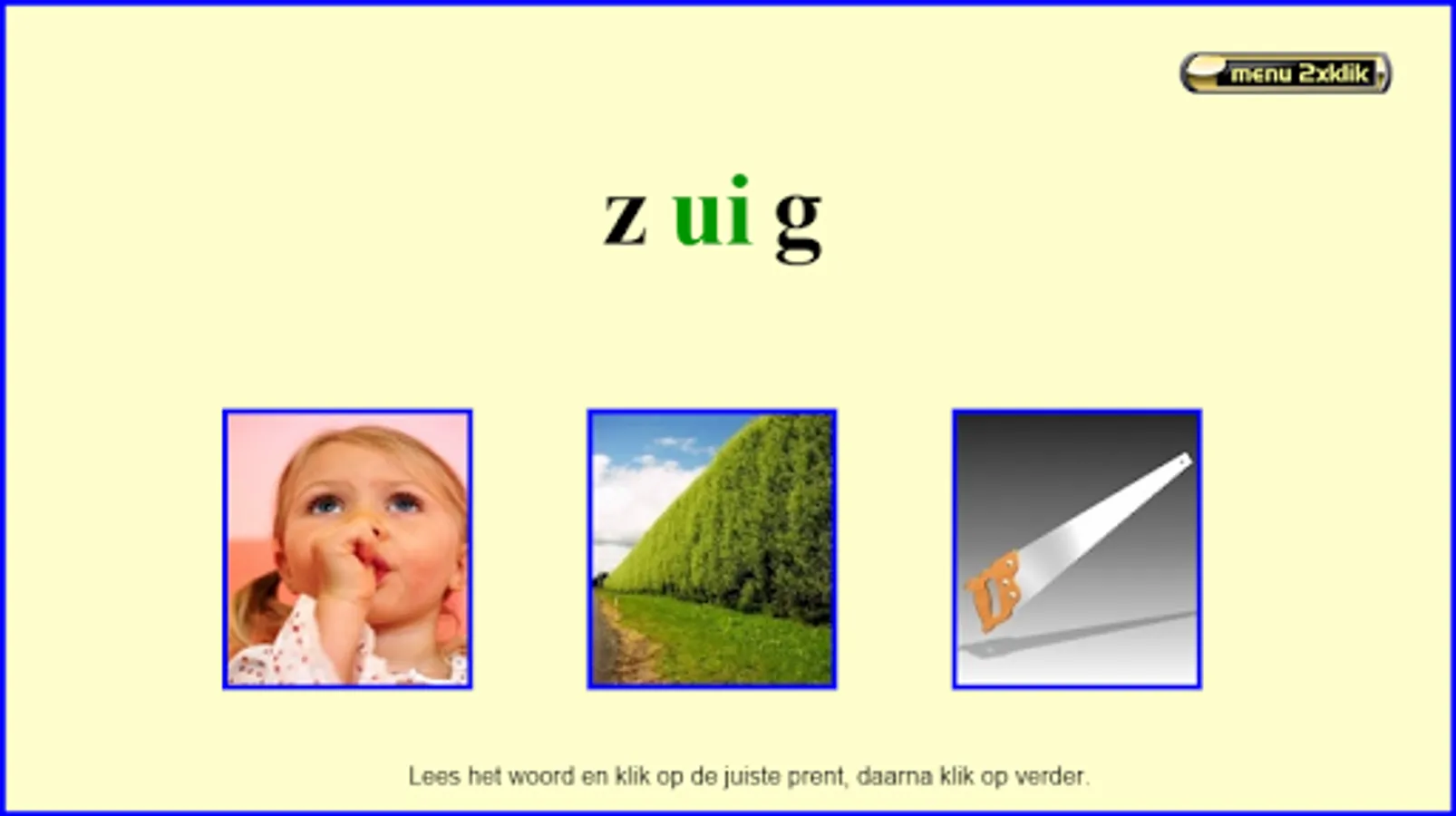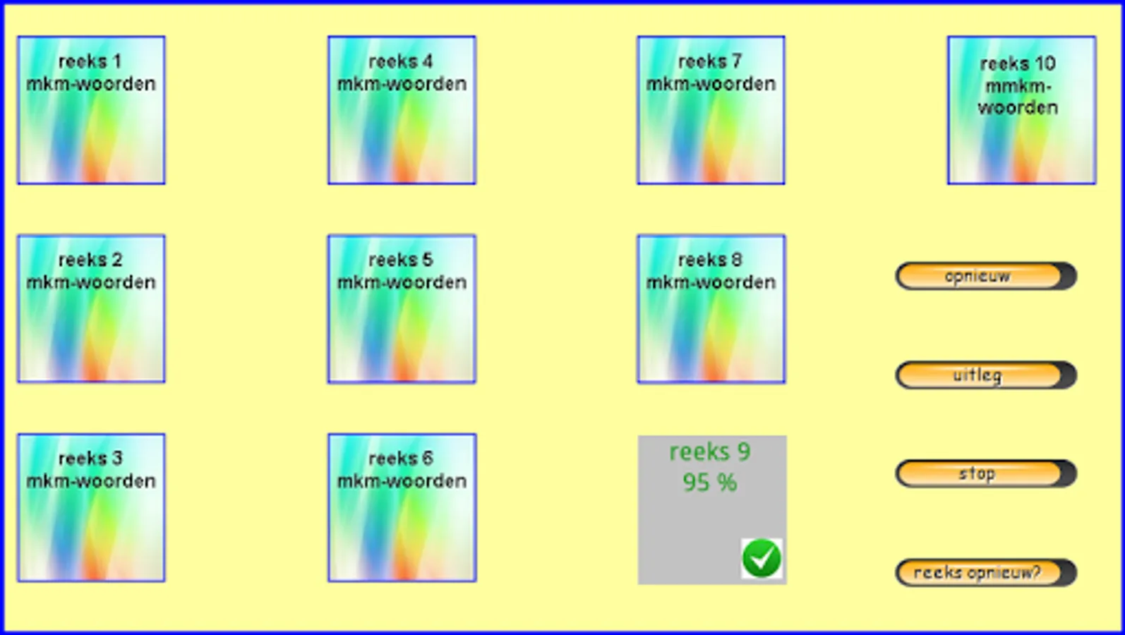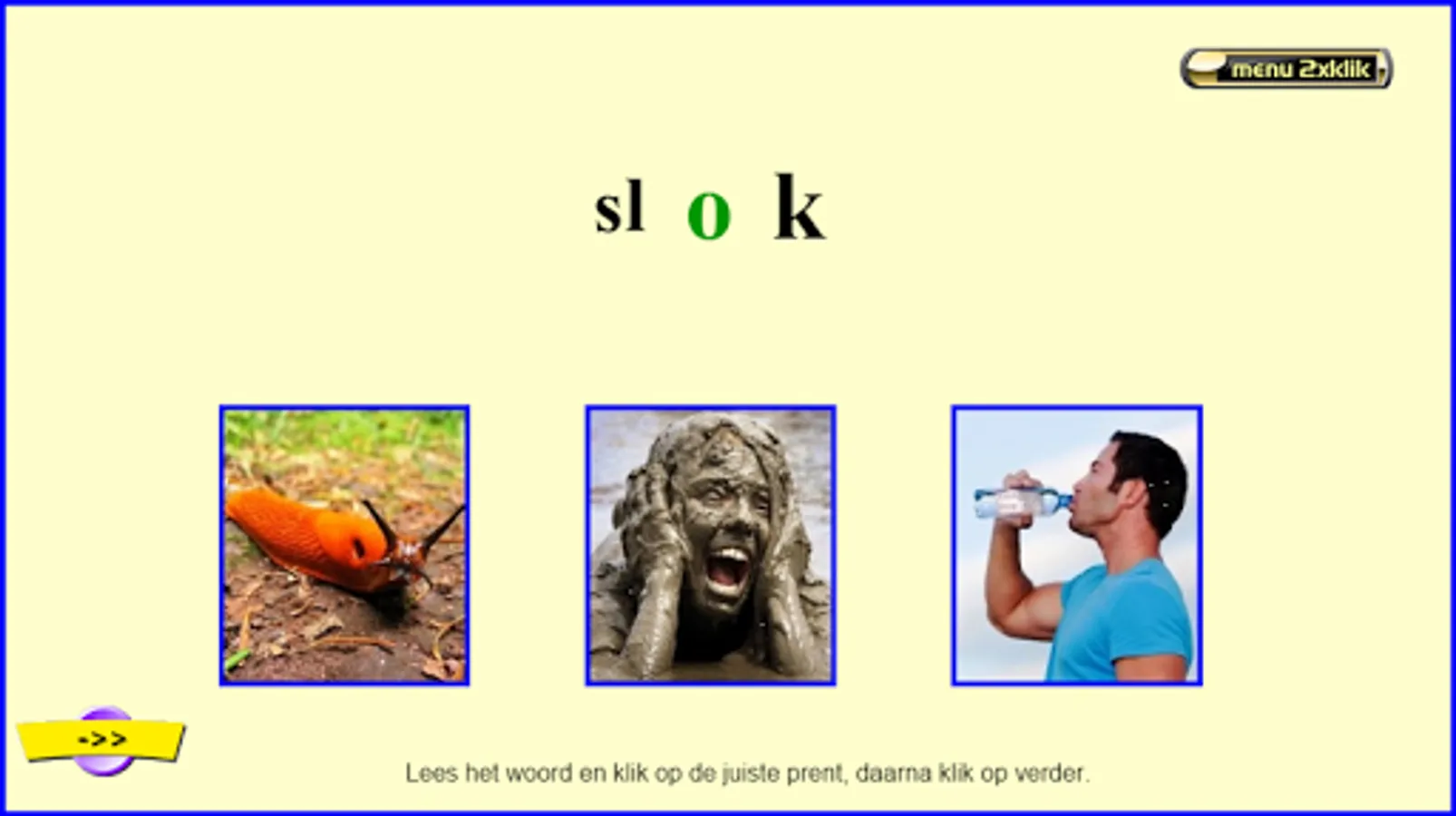 This series of reading exercises follows the reading method Safe Learning to Read from Zwijsen publishers (a widely used reading method in Belgium and the Netherlands). This exercise can be done after knowing all the letters. There are 8 sets of 20 mkm words and 2 sets of 20 mmkm words (200 words together). They are always interchangeable words in which only 1 letter is exchanged for another (sometimes the 2 starting sounds with mmkm words). All exercises are supported auditory by fully pronounced words and, in case of error, by words pronounced with separate sounds. Choose your series and then click on start. Read the word and click on the appropriate picture. Then click on '->>' etc… . Students of 1st grade/group 3 see the sounds 'aa,au,ee,eu,ie,ij,oo,oe,ou,uu,ui' as 1 letter!!! I made these exercises based on my 25 years of experience as a 1st grade teacher. Headphones make the sound even better. Works best on tablets. Not so suitable for smartphones.